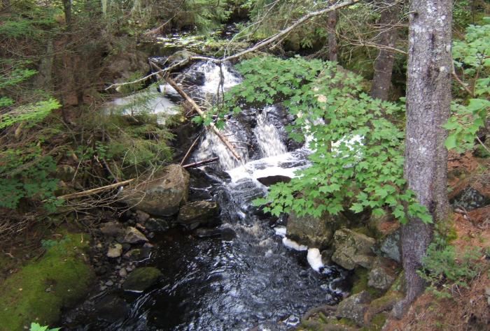Erbs Falls begins as a quickening of the water of Peters Brook in a narrowing gorge.