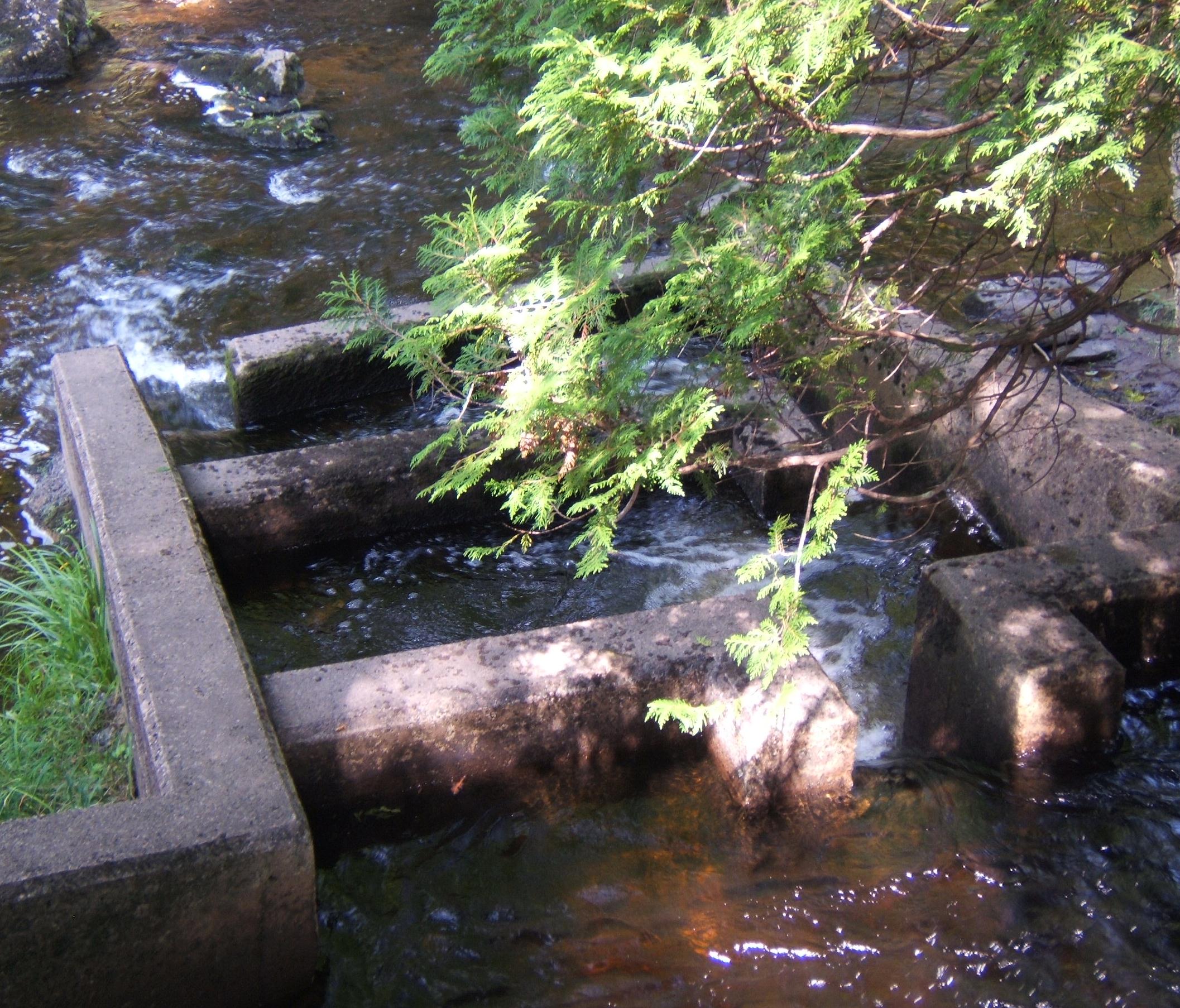 At this time of year, the water proceeds in one of two pathways, down the labyrinth of the fish ladder…