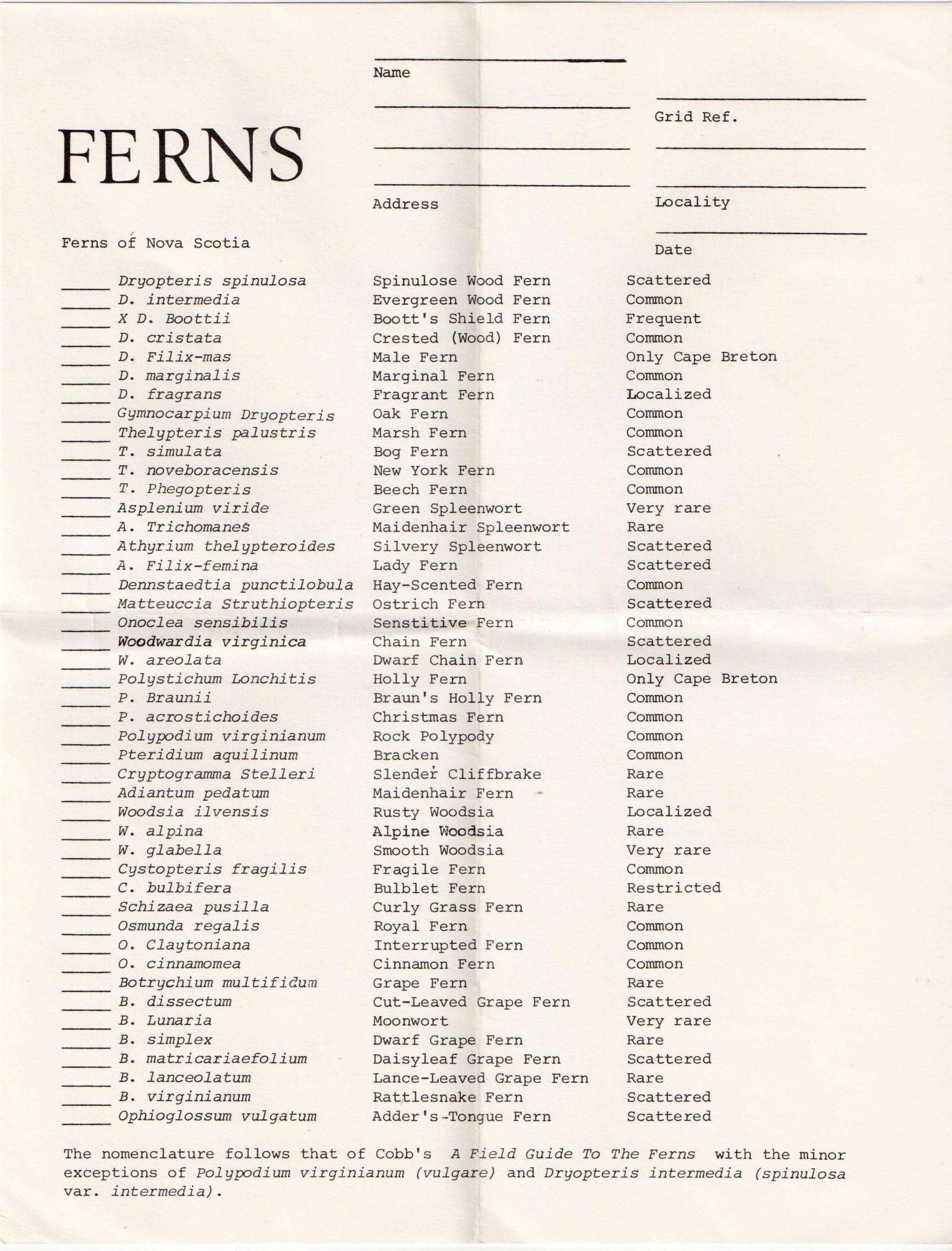 checklist issued by the Nova Scotia Museum for a fern project several years ago; a checklist like this is helpful to double-check your identification