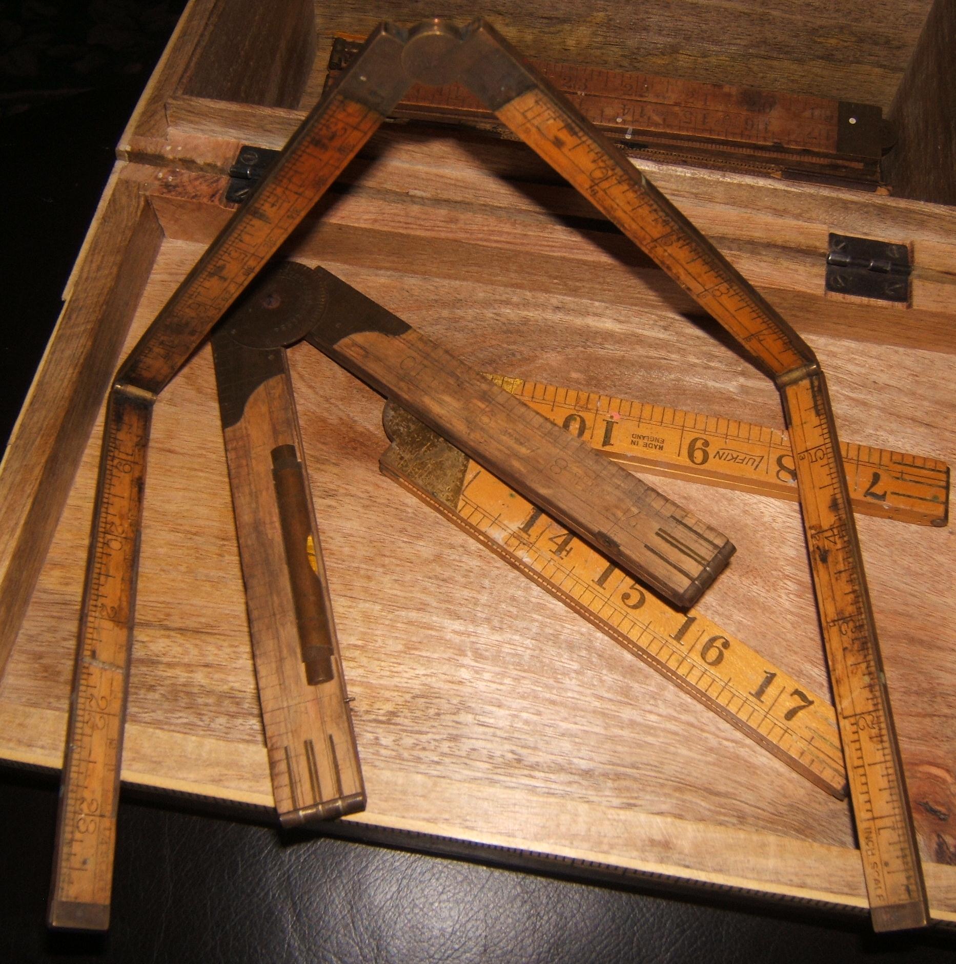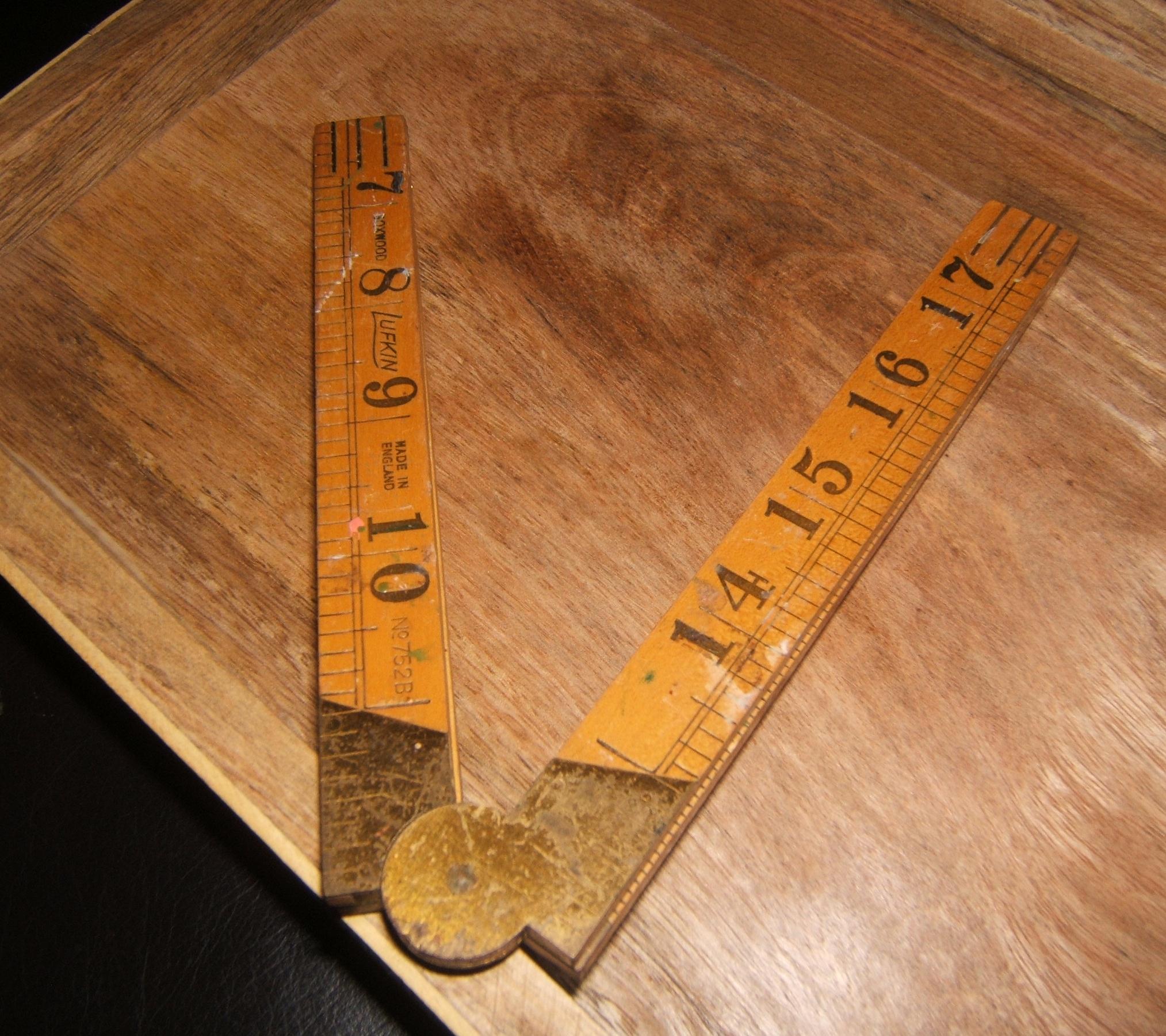 Most of my jointed rulers are made of wood with joints of brass. They can be folded away quite compactly when not in use, and unfolded when they are needed. Unfolded, they have a spidery quality. One of my favorites has a leveling glass built in…