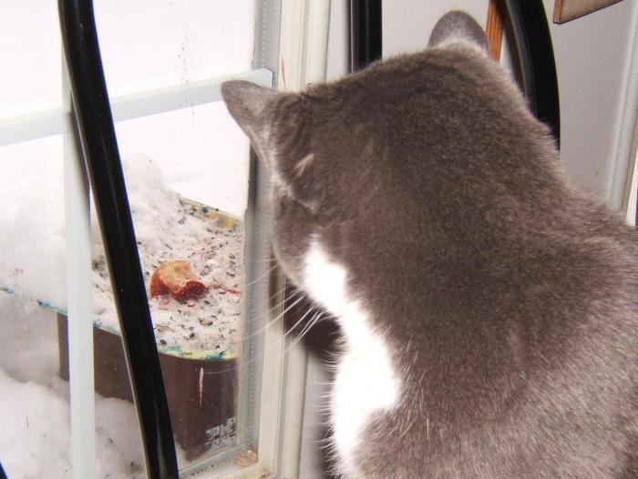 The birds and squirrels know they are being watched but have decided the sphinx behind the window glass cannot harm them. For her part, Zoe knows she can only observe the antics around the feeder. She contents herself with the pantomime of predation.