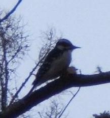 We are reasonably certain our bird was a Hairy Woodpecker. Its beak is noticeably long. Also, the round cut branch on the tree in the photo (in front of the bird’s feet) is at least an inch in diameter, making the length of this bird about nine and a half inches.