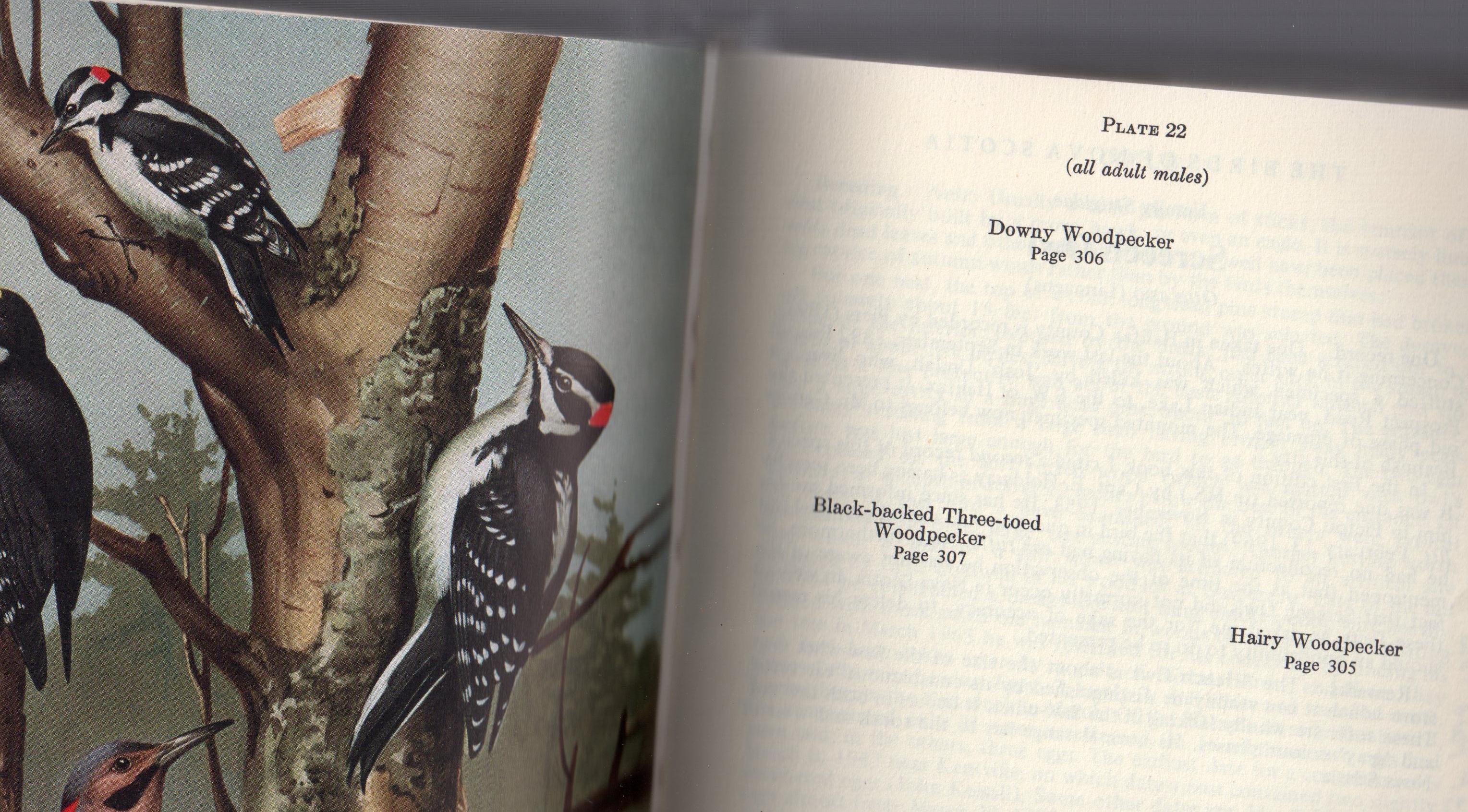 … and second, from his illustration in ‘The Birds of Nova Scotia’ by Robie W. Tufts (1973). In the ‘Field Guide’ , the markings on the white tail feathers of the Downy Woodpecker are clearer.