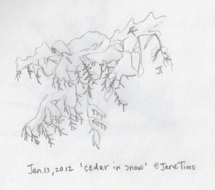 During my eight days in Ontario, we had a snow storm whose memorable characteristic was the size of its snowflakes. They were the biggest I’ve ever seen, as big as large marshmallows. Every fluffy snowball must have been the composite of a dozen individual snowflakes. After the storm, the trees were coated with white. The cedar were particularly beautiful, with their evergreen leaves each hanging beneath a personal burden of snow.