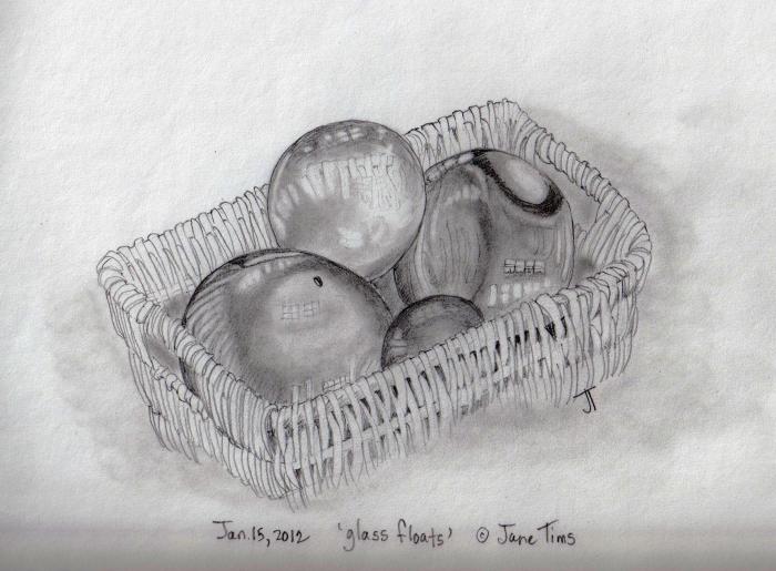 The tradition lives into the next generation… when I visited my family in Ontario for eight days, earlier this month, I was delighted to see a basket of variously-colored glass floats on the hearth of the wood stove.