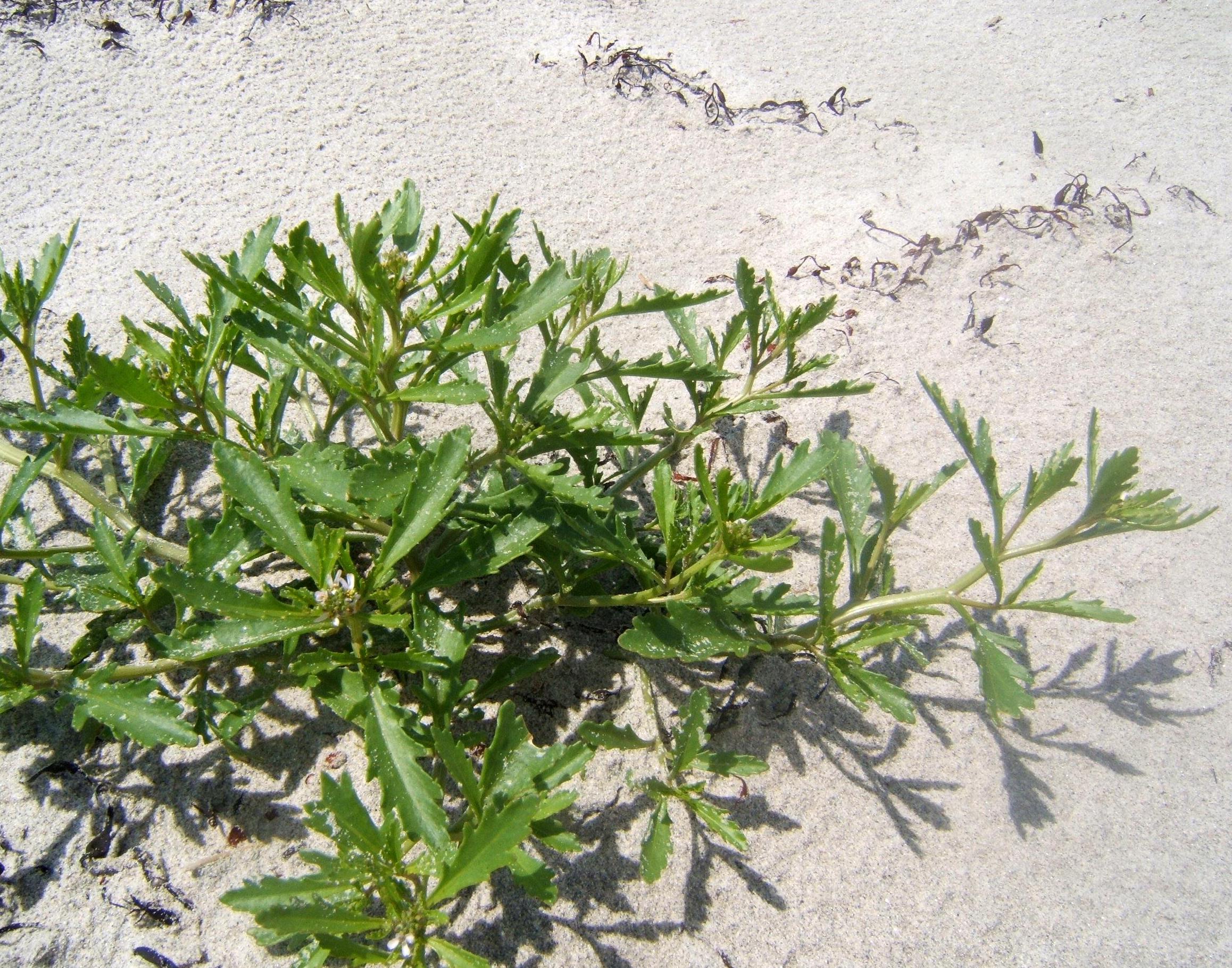 Cakile is a sprawling plant with succulent, branched stems. The leaves are thick and fleshy, with blunt-toothed margins. The four-petalled flowers are small, purple and located at the tip of the stem.