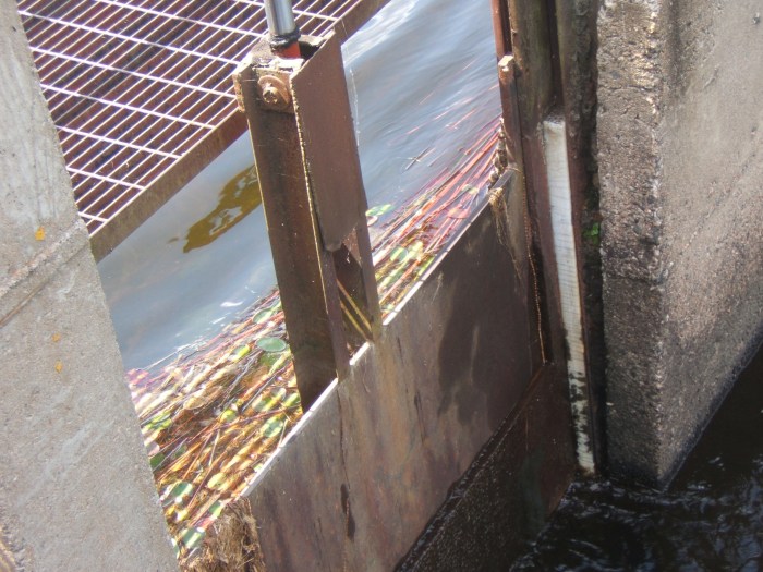 Last week we drove to South Oromocto Lake in Charlotte County and stopped beside the lake outlet where there is a dam, including a water control structure and a fish ladder. The long, red stems of up-rooted Water-shield (Brasenia Schreberi Gmel.) were gathered in tangles at the control structure.