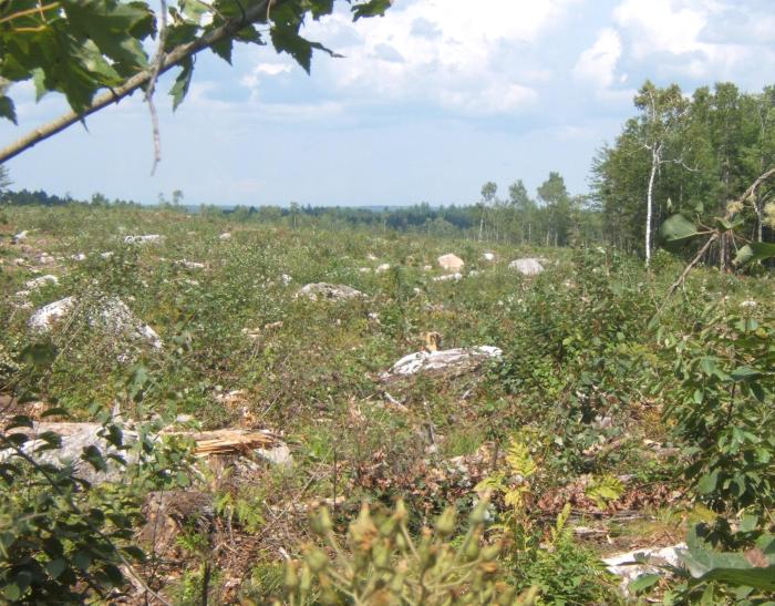 In one place, a clear-cut lay the landscape bare and we were able to see how frequently these glacial erratics occurred in the area. In the photo, you can see the boulders scattered in a ‘boulder field’. These boulders would have been deposited here by a glacier, thousands of years ago, perhaps during the Wisconsinan glaciation when almost all of Canada was covered by ice.
