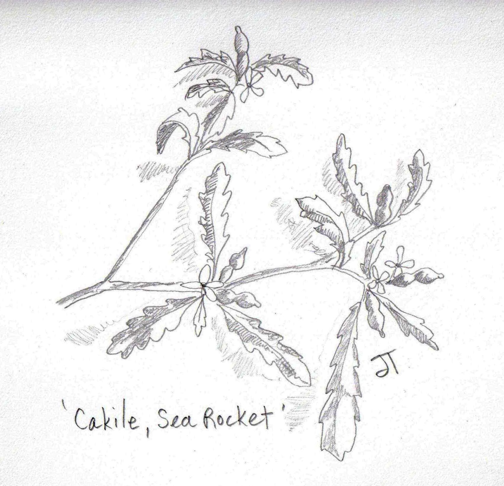 The name Sea-rocket comes from the distinctive shape of the seed pods. These have a narrow base and a pear-shaped tip, like a rocket. Cakile is an old Arabic name and edentula means ‘without teeth’.