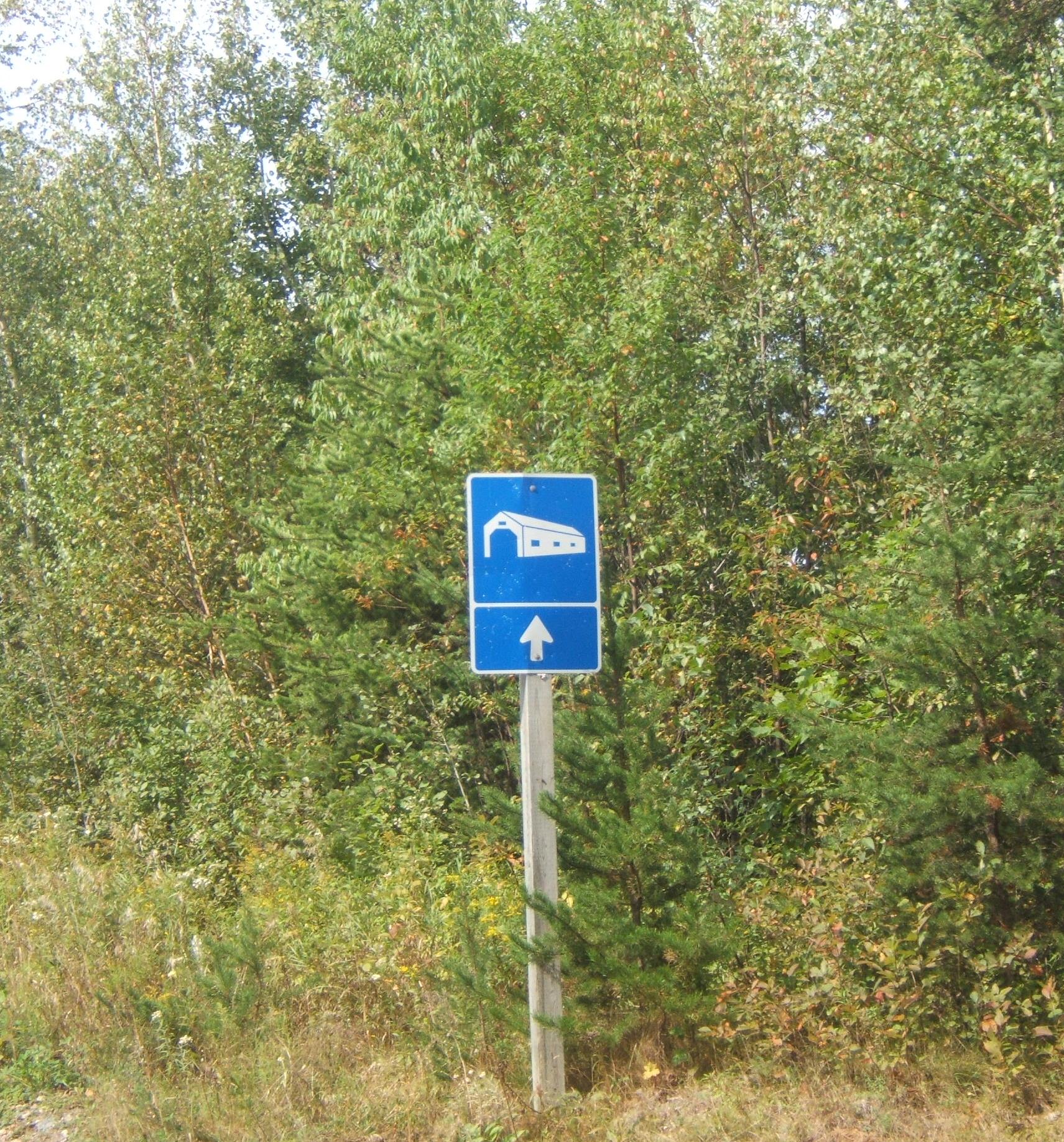 This past weekend, we visited the Falls Brook bridge again, to see if it is still there. The sign at the end of the road was hopeful, indicating a covered bridge could be found on the road. Most of New Brunswick’s covered bridges are marked by these signs.