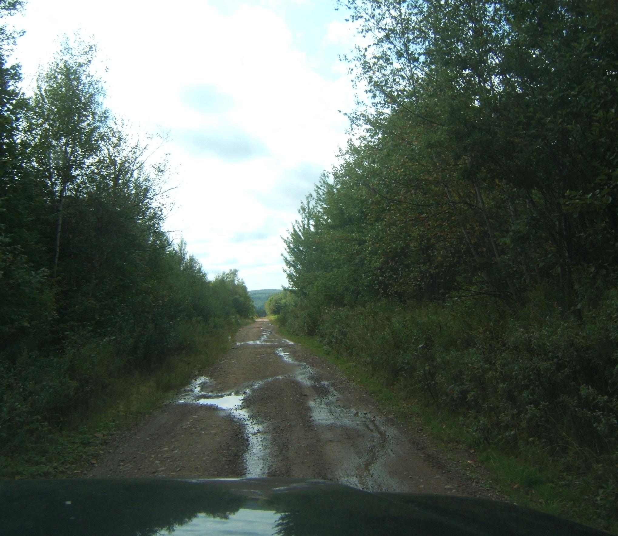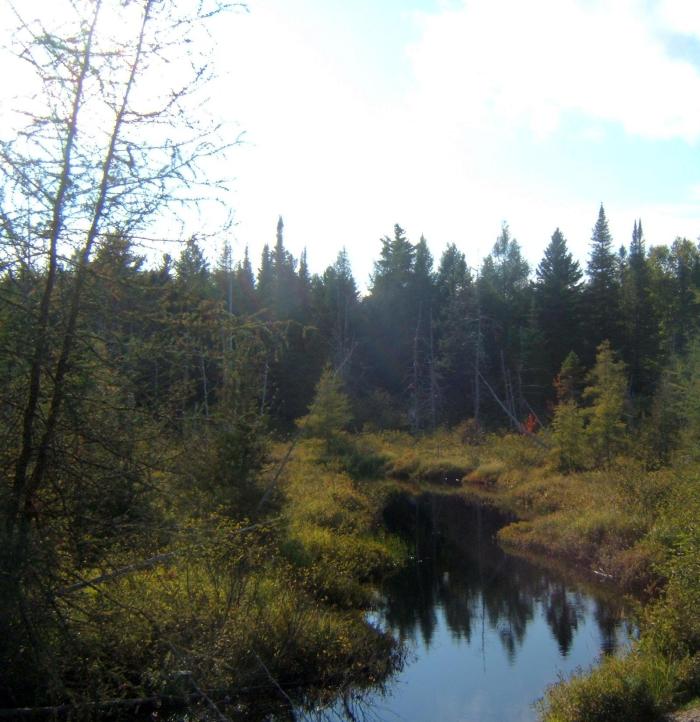 It was a good road, maintained by a local forest company. Along the way, we crossed a small metal bridge and I stopped to take a photo of a small stream winding its way through a bog.