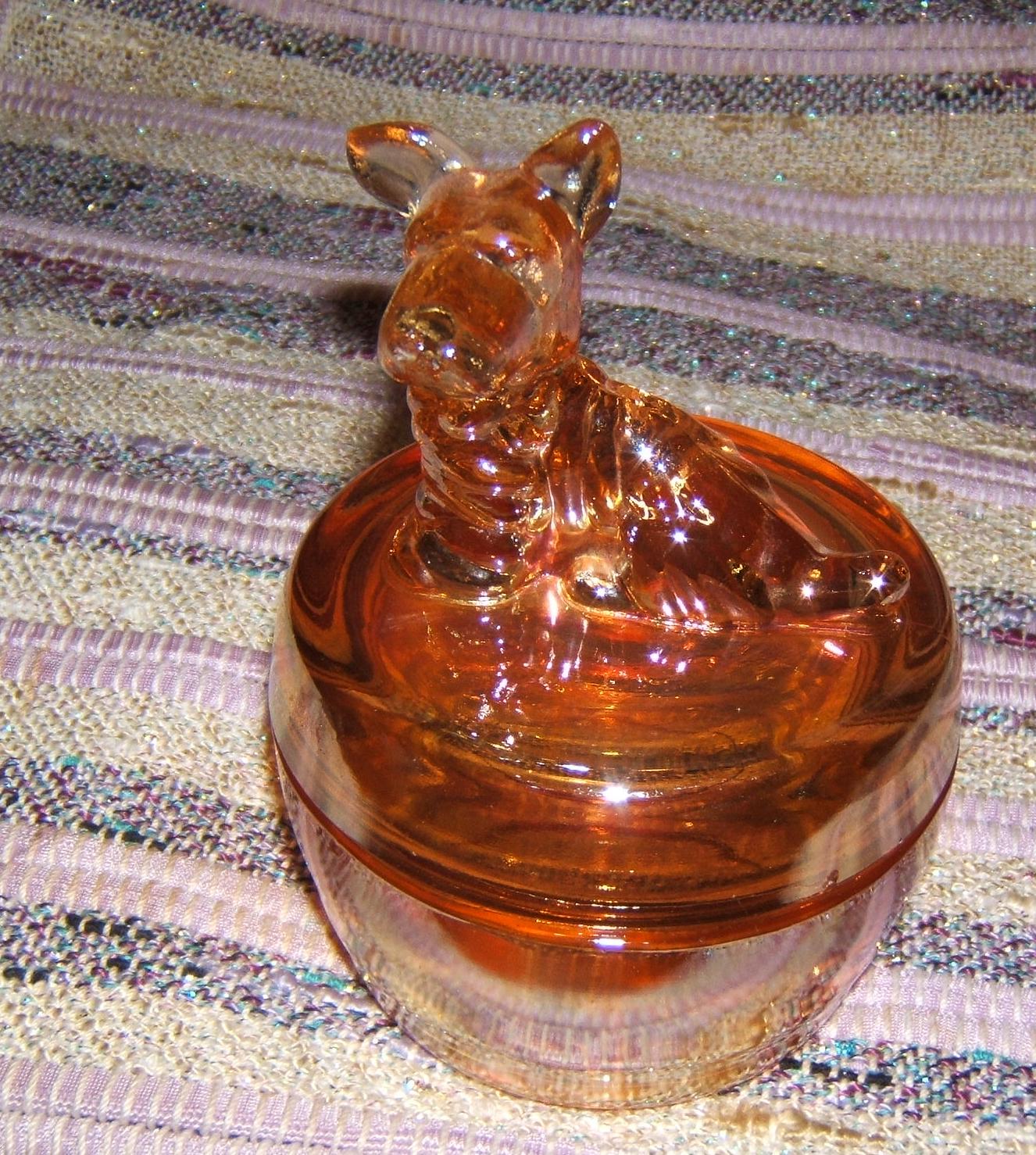 My Mom had an iridescent peach-colored dresser jar with a glass terrier on top and a pink-colored dresser jar with a young deer.
