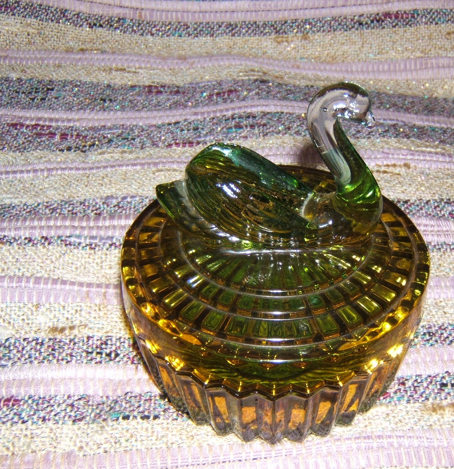 three swans, one green, one blue-green green and one amber (the swans have a cut-glass base and a hollow in their backs to hold lipstick)… I also have a clear swan, top only…