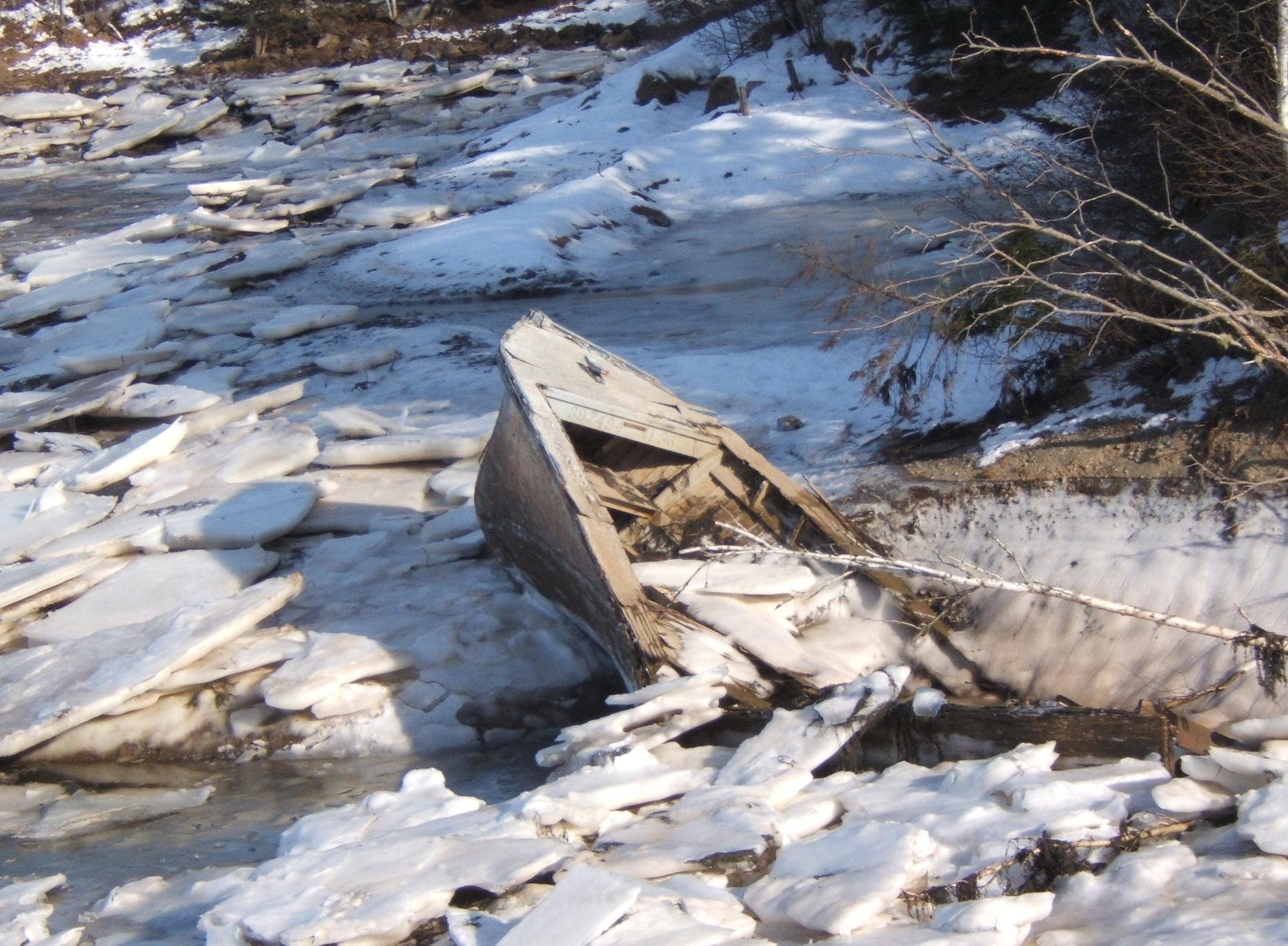 On Monday, we drove to Black’s Harbour. On the new highway, where it crosses the inland dregs of Oak Bay, the ice was broken into big sheets along the shore. There, in the icy debris, was an abandoned fishing boat, a wreck. Although I have never seen it before, it has probably been there a long time.