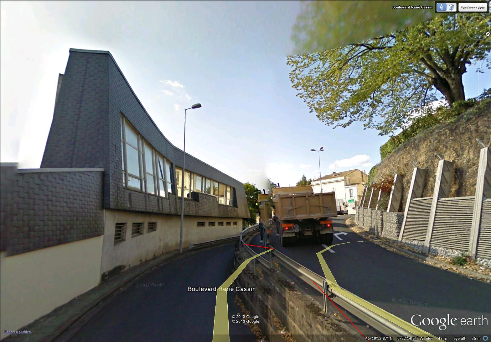 along the A 10 … all the lines painted on the road are white … the yellow line is from Street View and shows the path of the camera car … the red line is my bike path