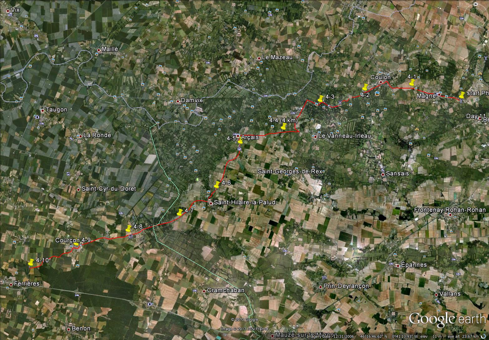 This is the continuation of the third phase of my virtual bike trip through central France. For Phase 3, I plan to bike in 12 days from Exireuil to Magné just west of Niort.