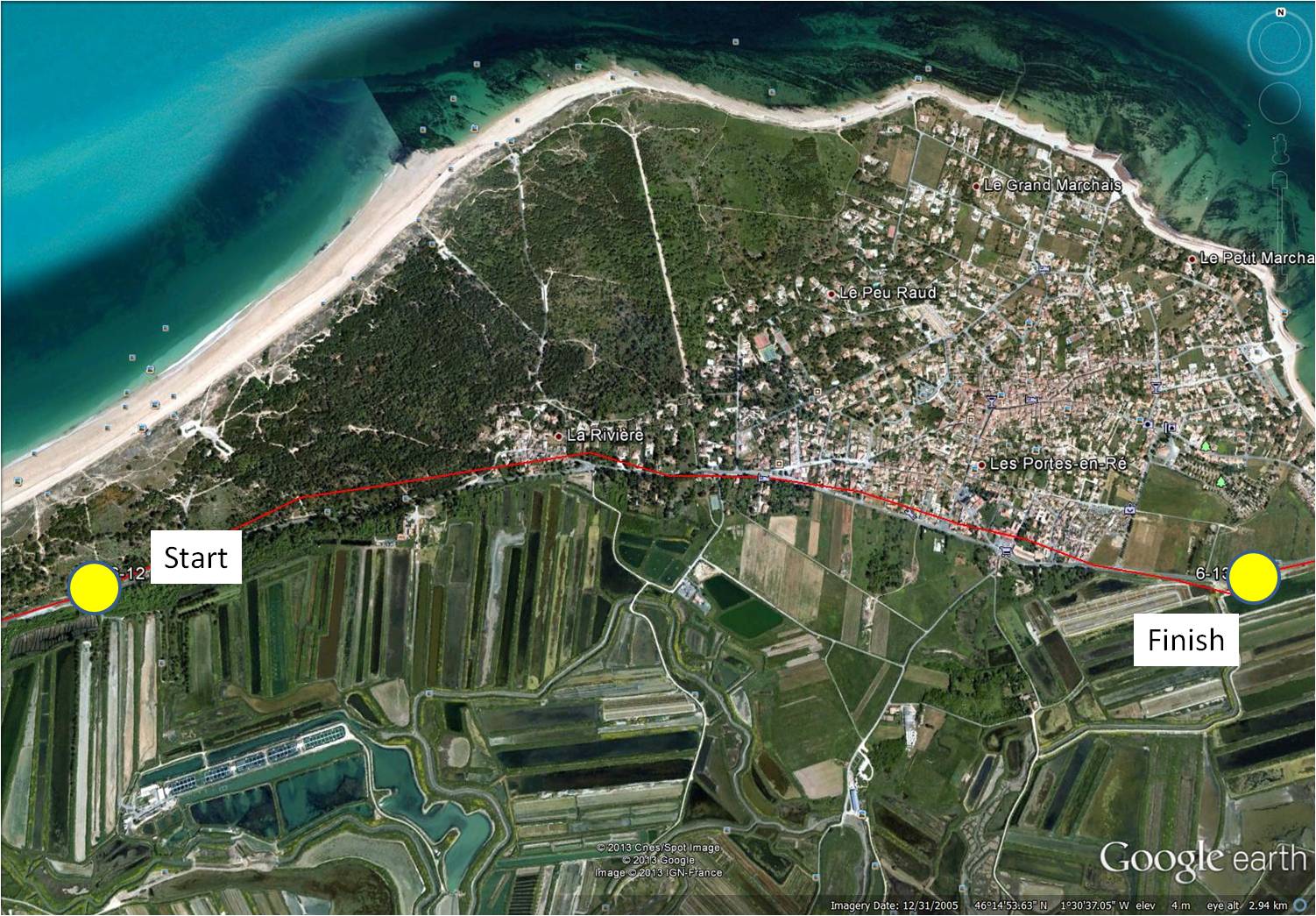 map showing distance travelled … the rectangular salt ponds on Ile de Re are visible (map from Google Earth)