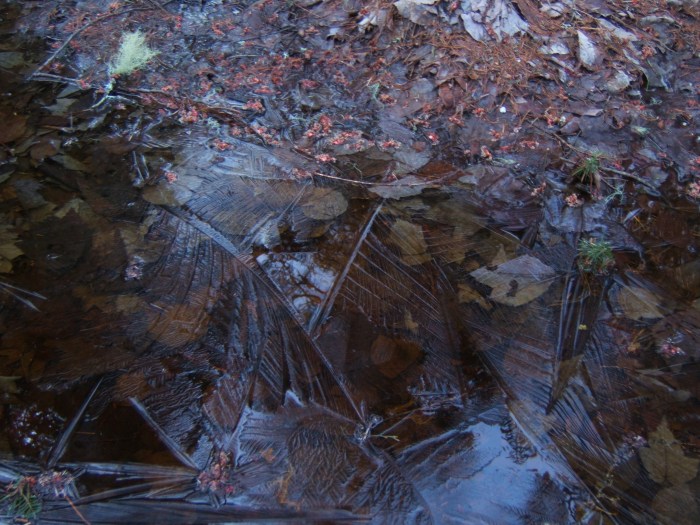 While we wait for a lasting snow in New Brunswick, ice defines the season. On every pool of standing water, ice-windows have formed. I love the patterns these make against the amber-colored water! These are photos of ice windows taken last spring, after the snow had gone.