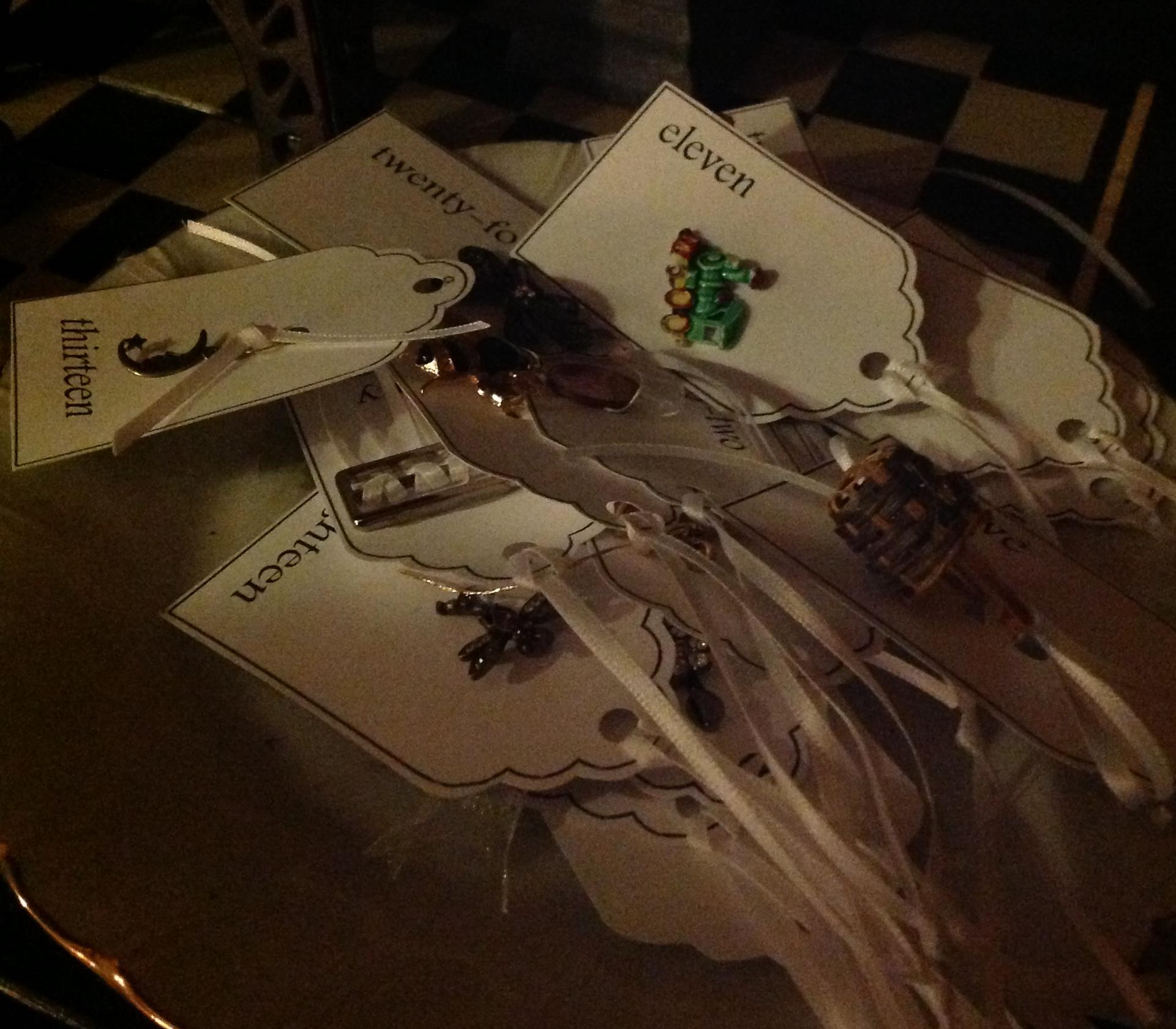 I printed tags with the numbers spelled out and fixed a small memento to each one. Most of these are trinkets I have kept in odd drawers over the years – mismatched earrings, buttons, acorns, feathers, shells, Christmas pins and so on. I threaded a ribbon through a hole punched in the tag. Each day since December 1, I have hung a new ornament, tying them to the bar of a drying rack we have in the living room.
