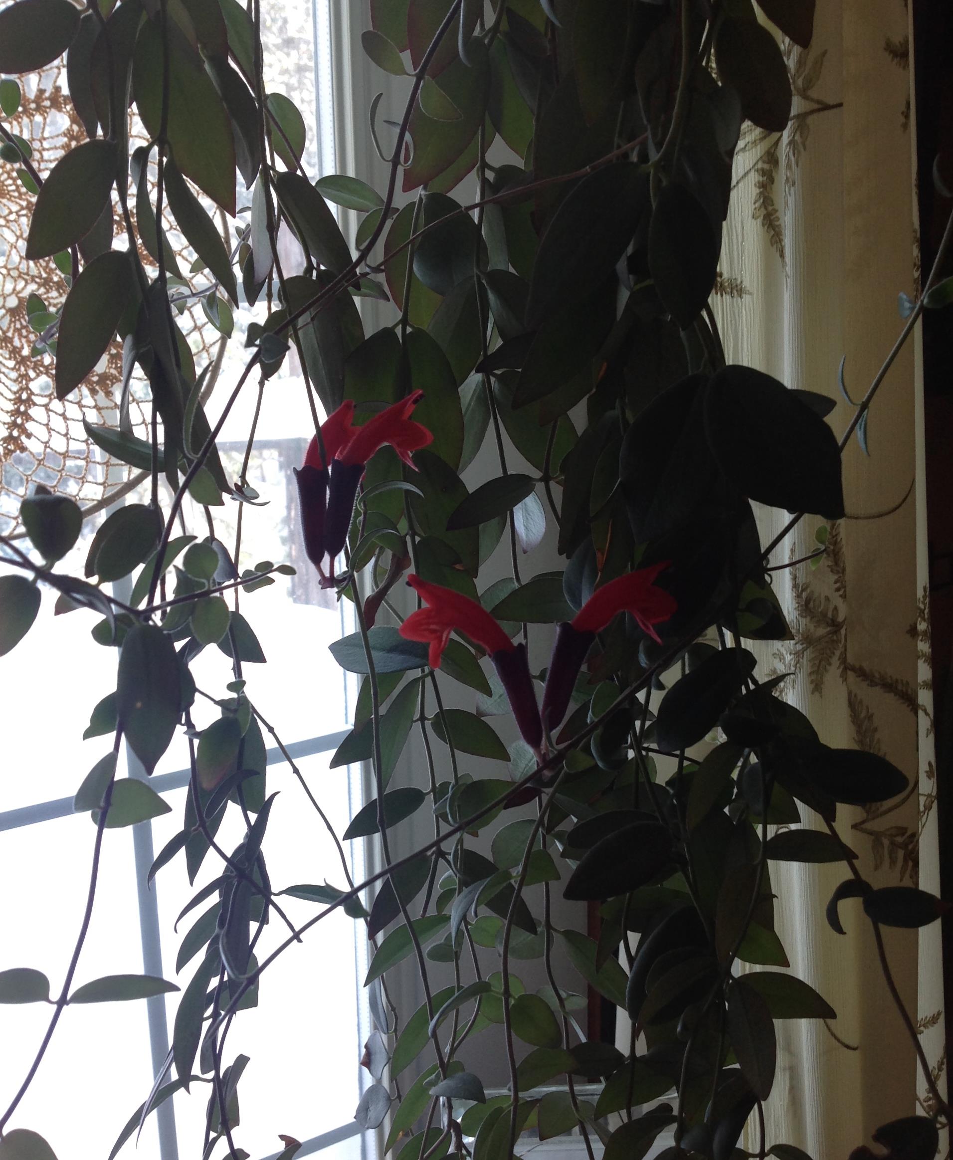 A couple of my houseplants have given me an early Christmas gift. I had a hearty blooming of my Christmas Cactus early in December, and then, last week, my Lipstick Plant (Basketvine) (Aeschynanthus pulcher) burst into brilliant red blooms. Aeschynanthus is a subtropical genus from the same family as African Violets. This is the second time it has bloomed for me in the last two years.