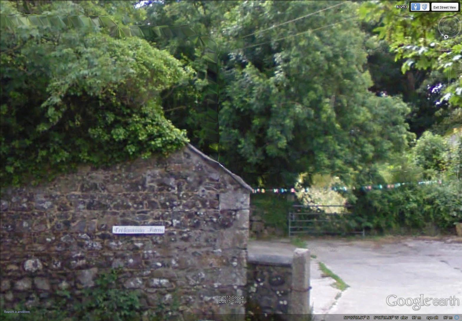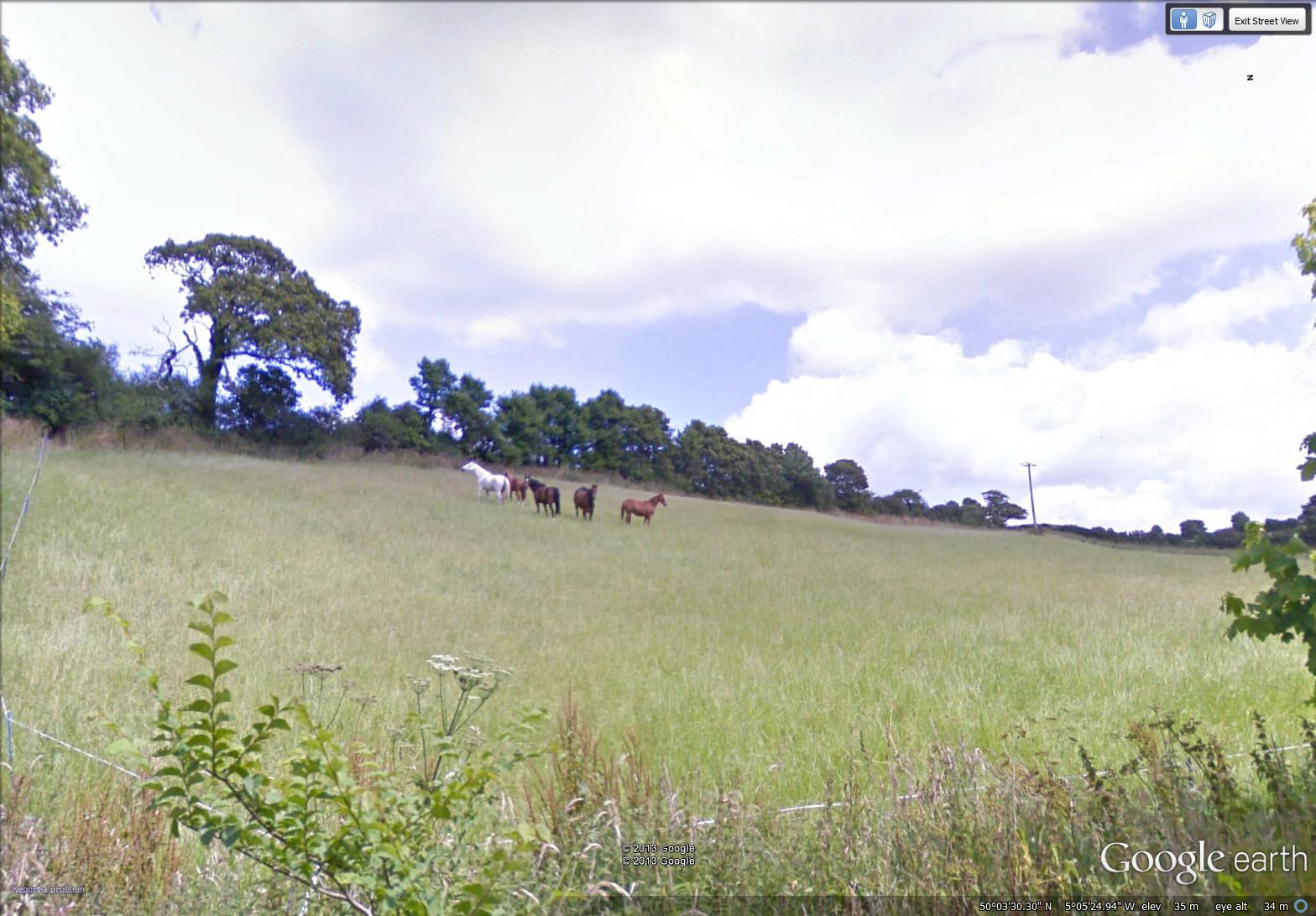 The area I found is anything but brown (Street View images were done in July). These are the Goonhilly Downs, a raised plateau of heathlands above serpentinite rock. Besides being a Site of Special Scientific Interest and the home of many rare plants, the heathlands are the location of a large windfarm (I could just see the turbines in the distance) and the Goonhilly Satellite Earth Station (the largest in the world).