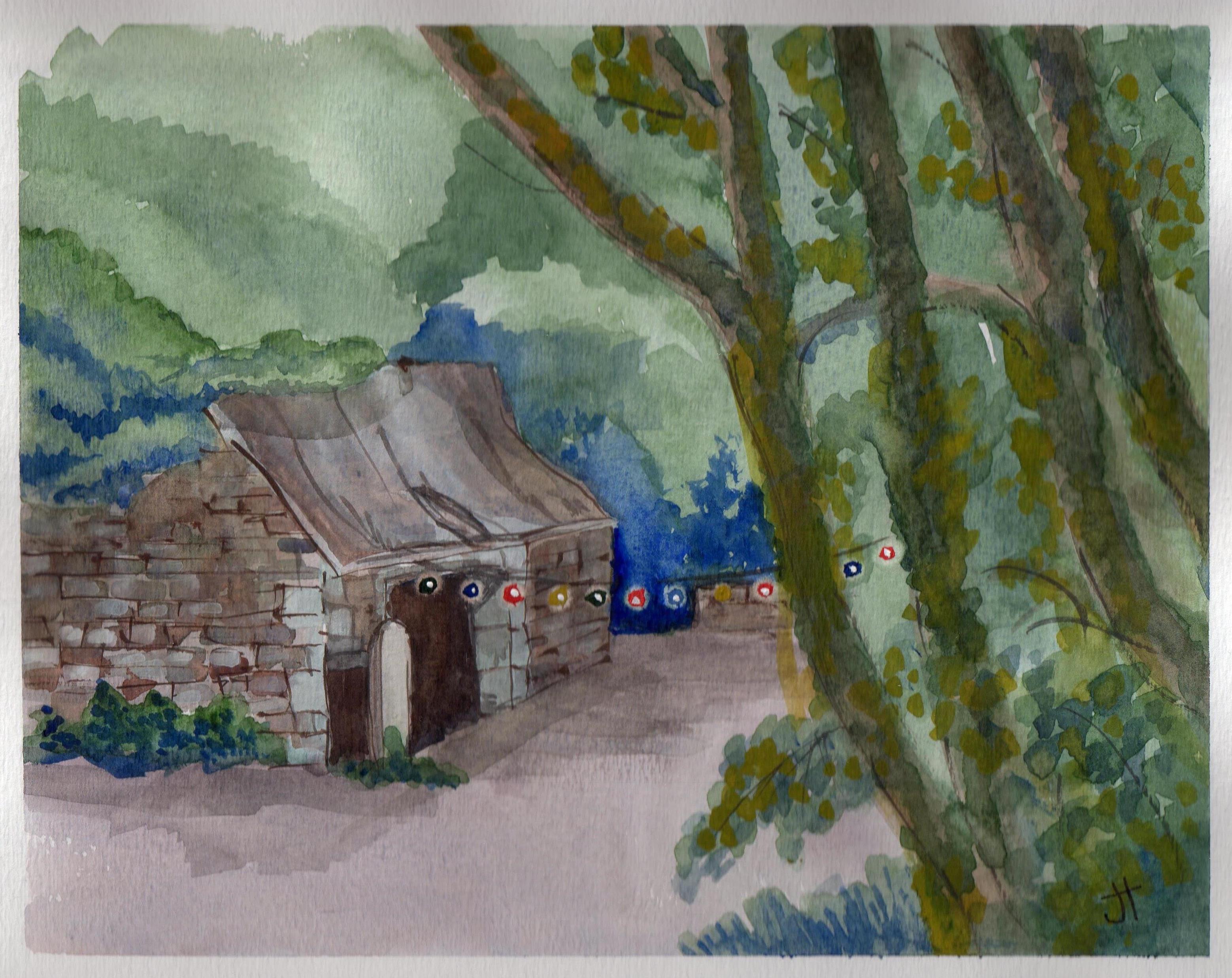 It was only after I painted this and showed it to my husband, I realised I had painted a string of Christmas lights! The lights in the Street View image could have been patio lanterns, but my paint brush was thinking Christmas!!!