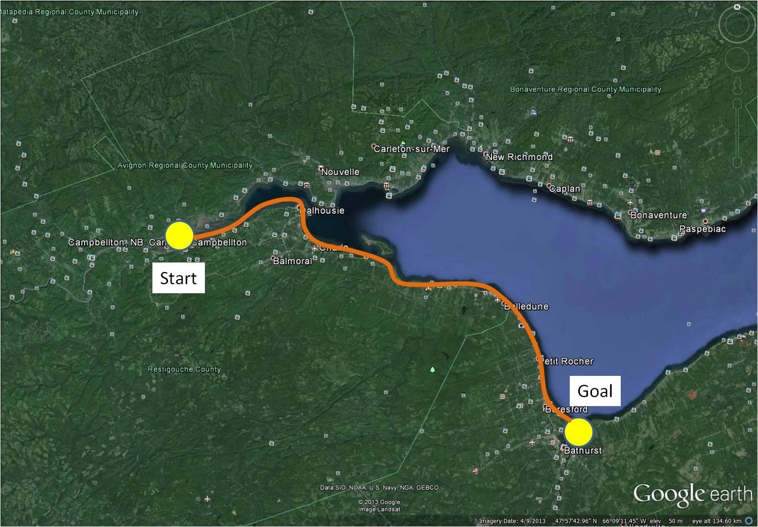 In Phase 8 of my virtual travel, I will start in northern New Brunswick, in Campbellton, and follow along the coast of the Baie de Chaleur to the city of Bathurst for a distance of about 110 km. This is the area I explored in the 1980s as part of my work on air quality in the province. It is also an area where we have taken various drives and vacations.