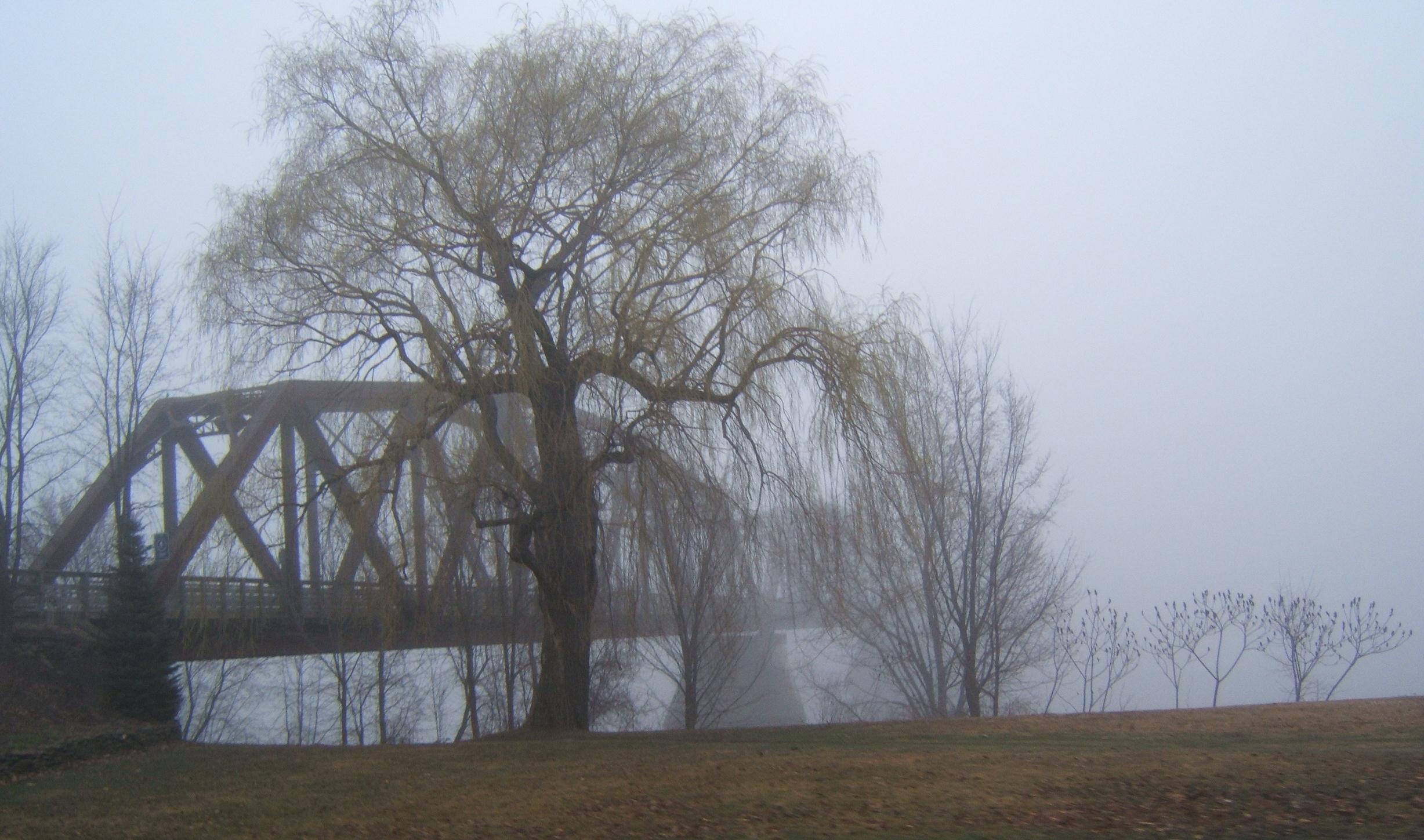 Especially in fog, Waterloo Row presents some lovely vignettes, including ghostly images of the St. John River, with the old bridge, now a footbridge, vanishing into the mist…