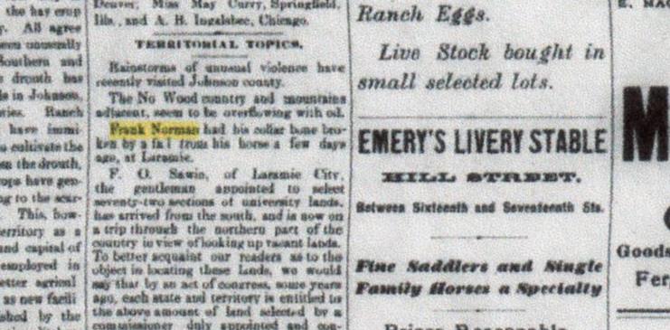 You may recall that I already know of an item about my great-grandfather in the July 26, 1886 edition of the Laramie ‘Daily Boomerang’ (page 4). On July 25, 1886, he fell from his horse and broke his collar bone, only a day after he and my great-grandmother Ella were married.
