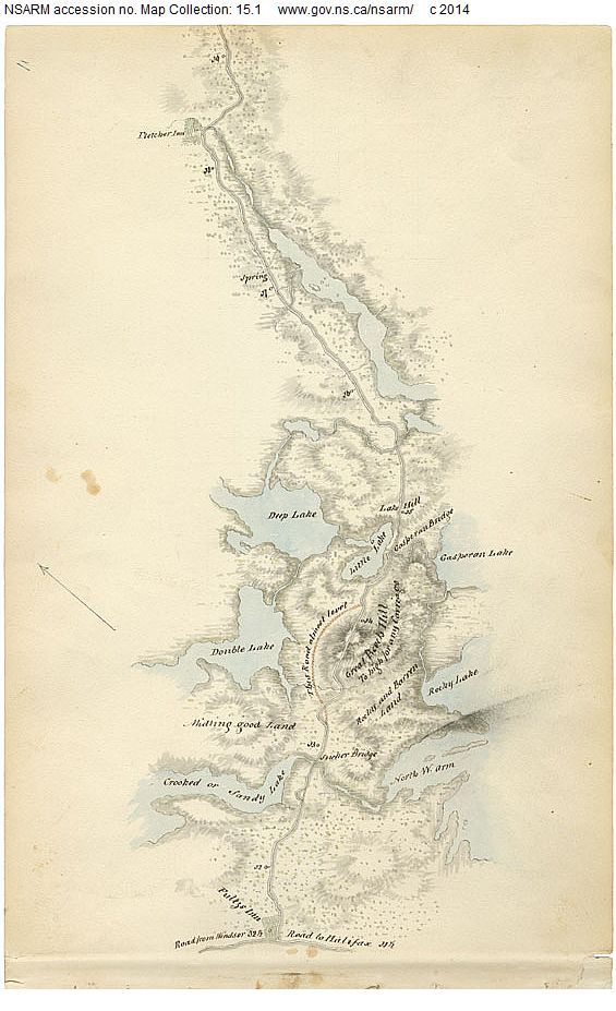 Our History teacher, Mr. Harvey, was a great inspiration, taking us to all the historical nooks and crannies in the area. Our History Club researched the first length of the old stagecoach route between Lower Sackville and Truro (surveyed in 1817-1818 by Woolford; for an old map of this road, see http://www.novascotia.ca/nsarm/virtual/woolford/archives.asp?ID=11). For the project we actually walked the old road, even then almost obscured by the growth of the forest. We could still see the path of the road by looking for the younger trees in the landscape, and we could find the old culverts. Later, we made a 3-D model of the road and its path between lakes and hills. Today, the old road begins at the Fultz Museum in Sackville (once Fultz’s Twelve-mile House, an inn along the way) and follows various local roads, including part of the Old Cobequid Road. I once lived (my first apartment) just across the lake from the old road (the long lake in the upper part of the map below).