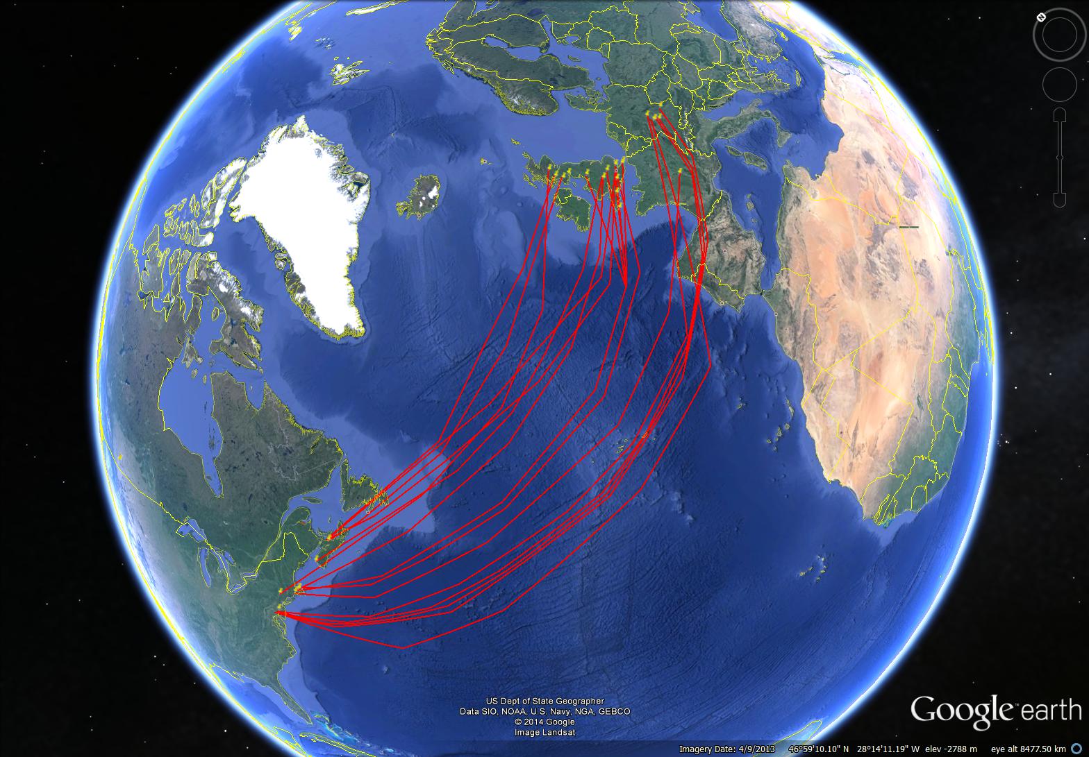I plotted these on a map of the world. Each red line represents the voyage of one or more of my ancestors across the Atlantic from the place of their birth in England, Scotland, Germany or France.