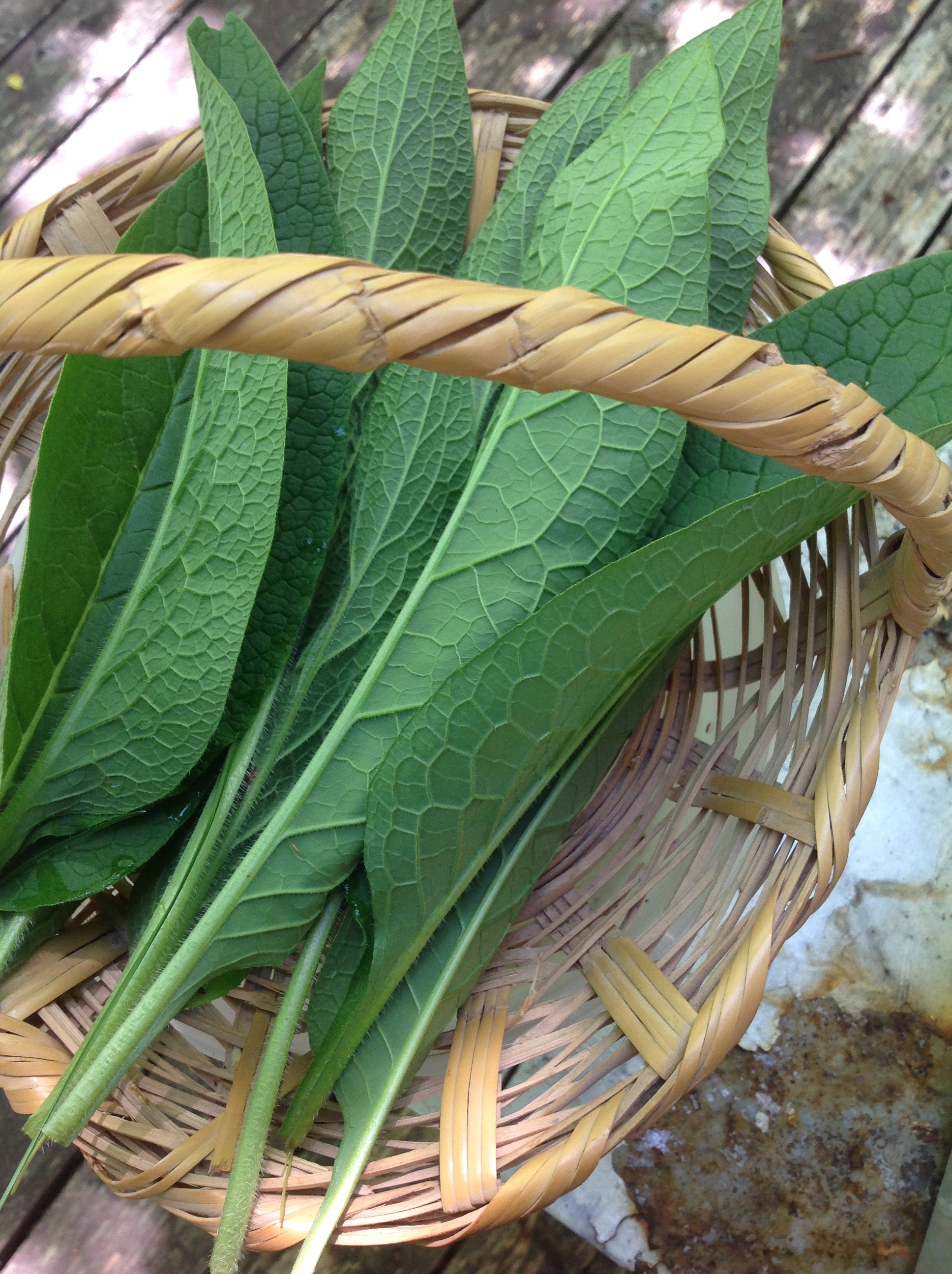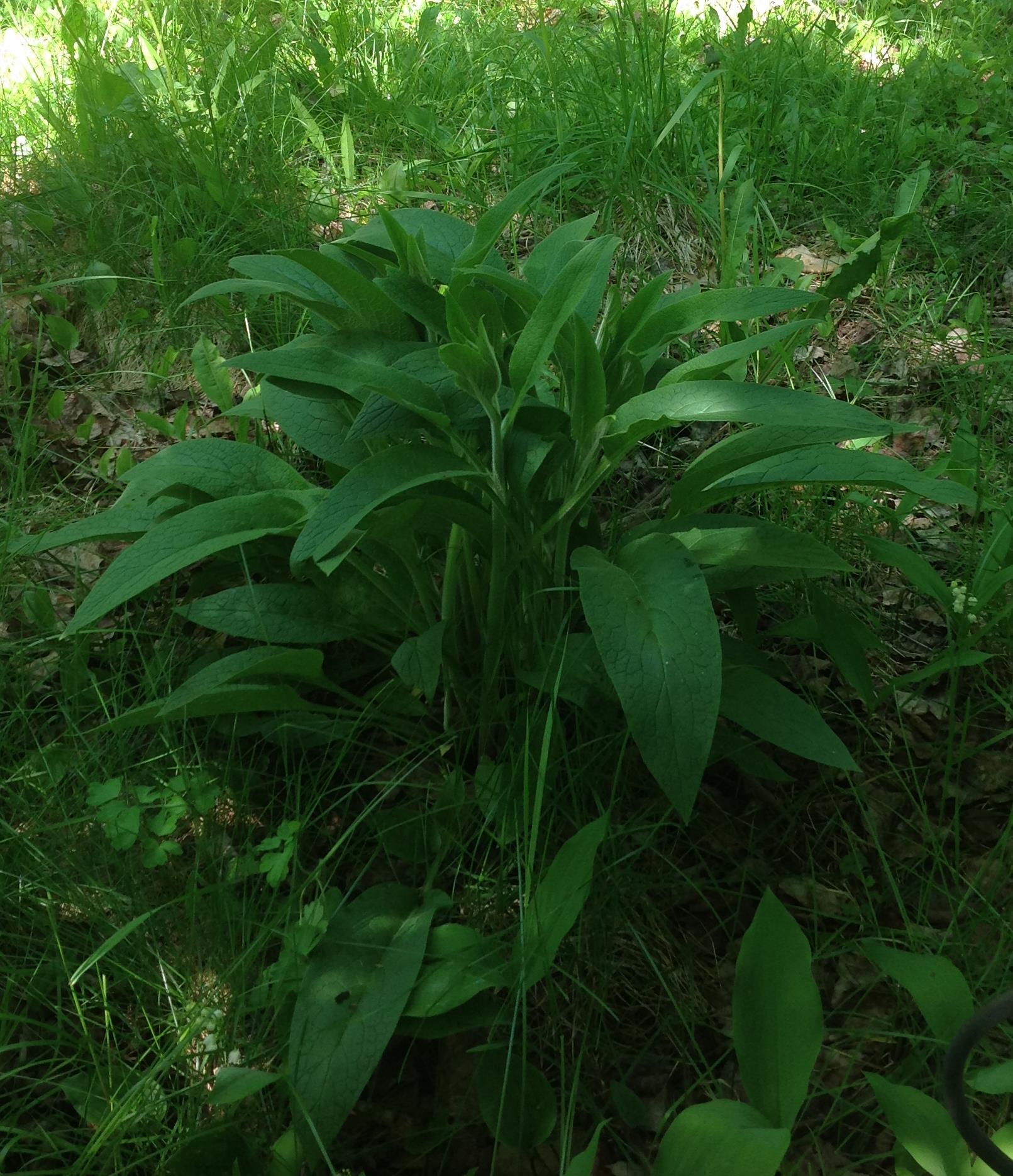 Comfrey grows in large clumps of linear leaves, up to a meter tall. Its stately foliage provides a great backdrop for smaller plants. Later in the season, it will produce curved clusters of bluish-purple flowers.