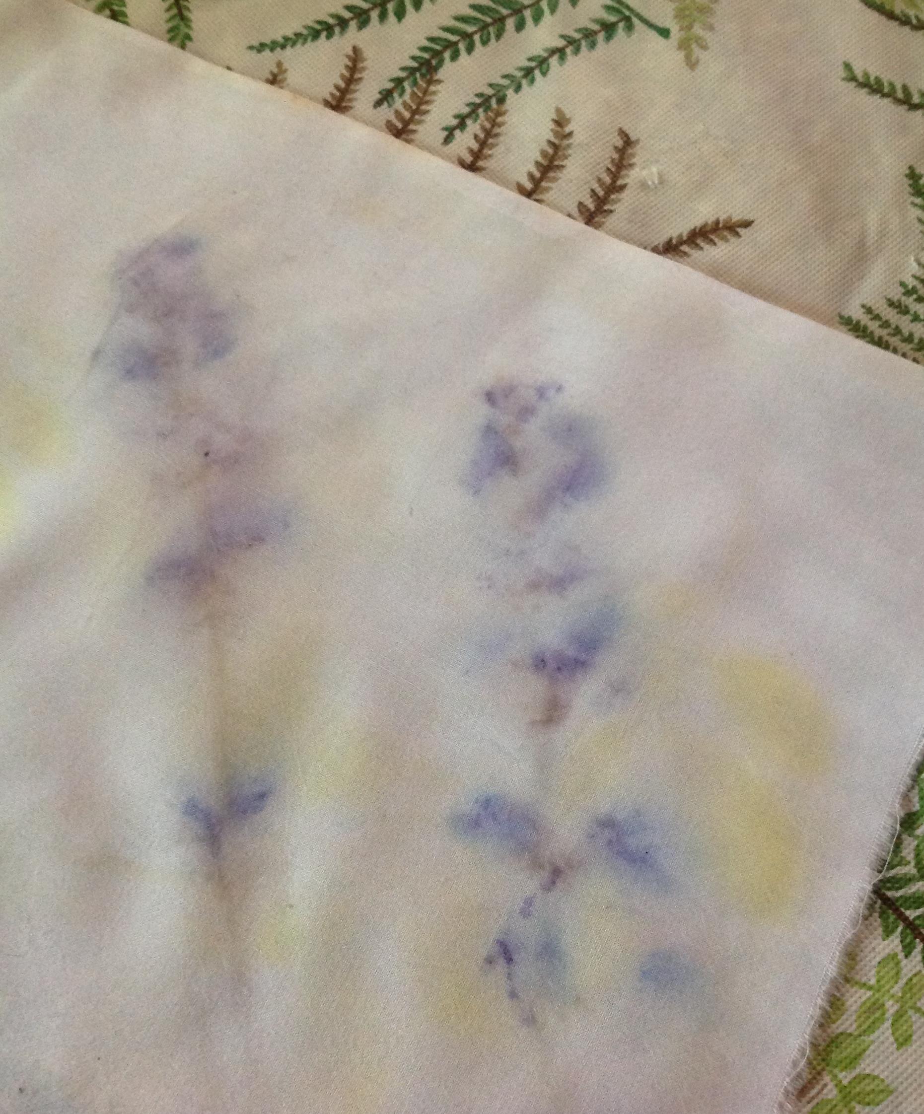 I placed the flowers between two layers of cotton, sprayed the material with water and pressed down with the steam iron set on medium. I pressed fairly hard and ironed the cloth/flower sandwich until it was dry. Then I wetted it again and continued until I had transferred the colour …