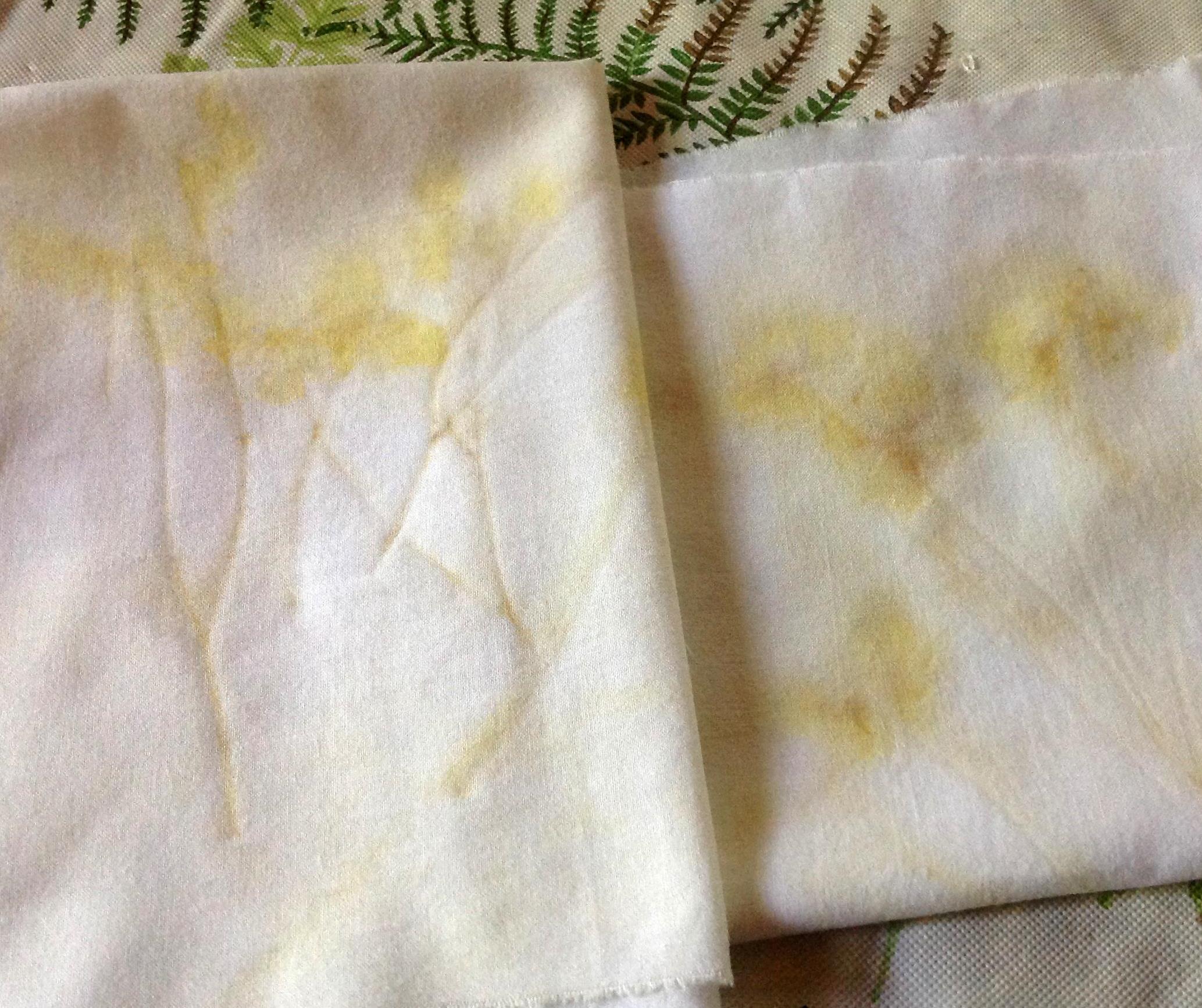 After our drive to Canterbury over the weekend, I was anxious to capture some of the roadside flower colour in my ‘harvesting colour’ experiments. I decided to try a technique described by India Flint in her book Eco Colour: Botanical Dyes for Beautiful Textiles (Interweave Press, 2010). ‘Ecoprinting’ involves bringing a plant into close contact with a fabric in order to transfer the colour to the cloth. I am very impressed with the effects shown in Eco Colour – prints of leaves, flowers and berries.