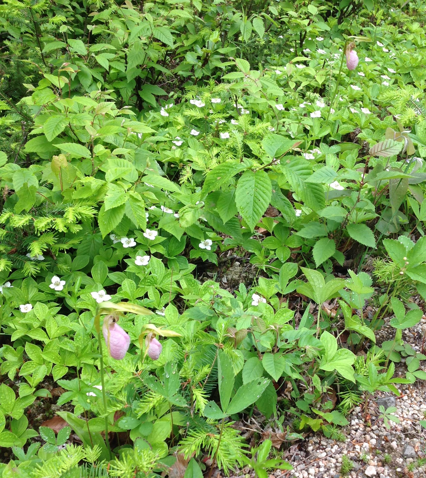 As we drove, I watched the woods for those blue flowers. Wildflowers were certainly a theme of our drive. By the road we saw Pink Lady’s Slipper (Cypripedium acaule), Bluebead Lily (Clintonia borealis), Bunchberry (Cornus canadensis) and Quaker Ladies (Houstonia caerulea).