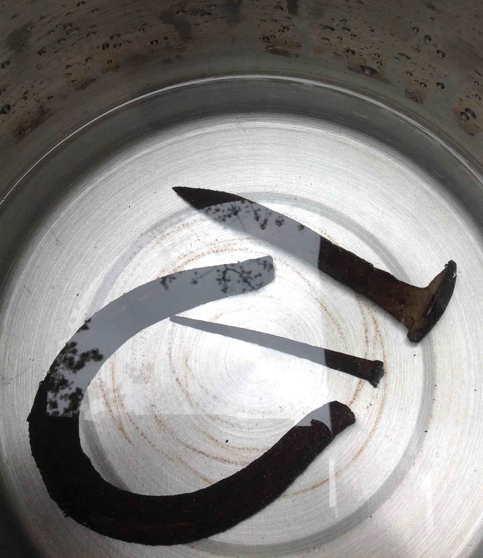 To modify colour with iron, the dyer can use ferrous sulfate as a powder. Or rusty iron can be used to make an iron acetate solution. To make my iron modifier, I put an old horseshoe, a square nail and a rail spike in a pot, added some vinegar, and soaked the metal in rainwater for a month.