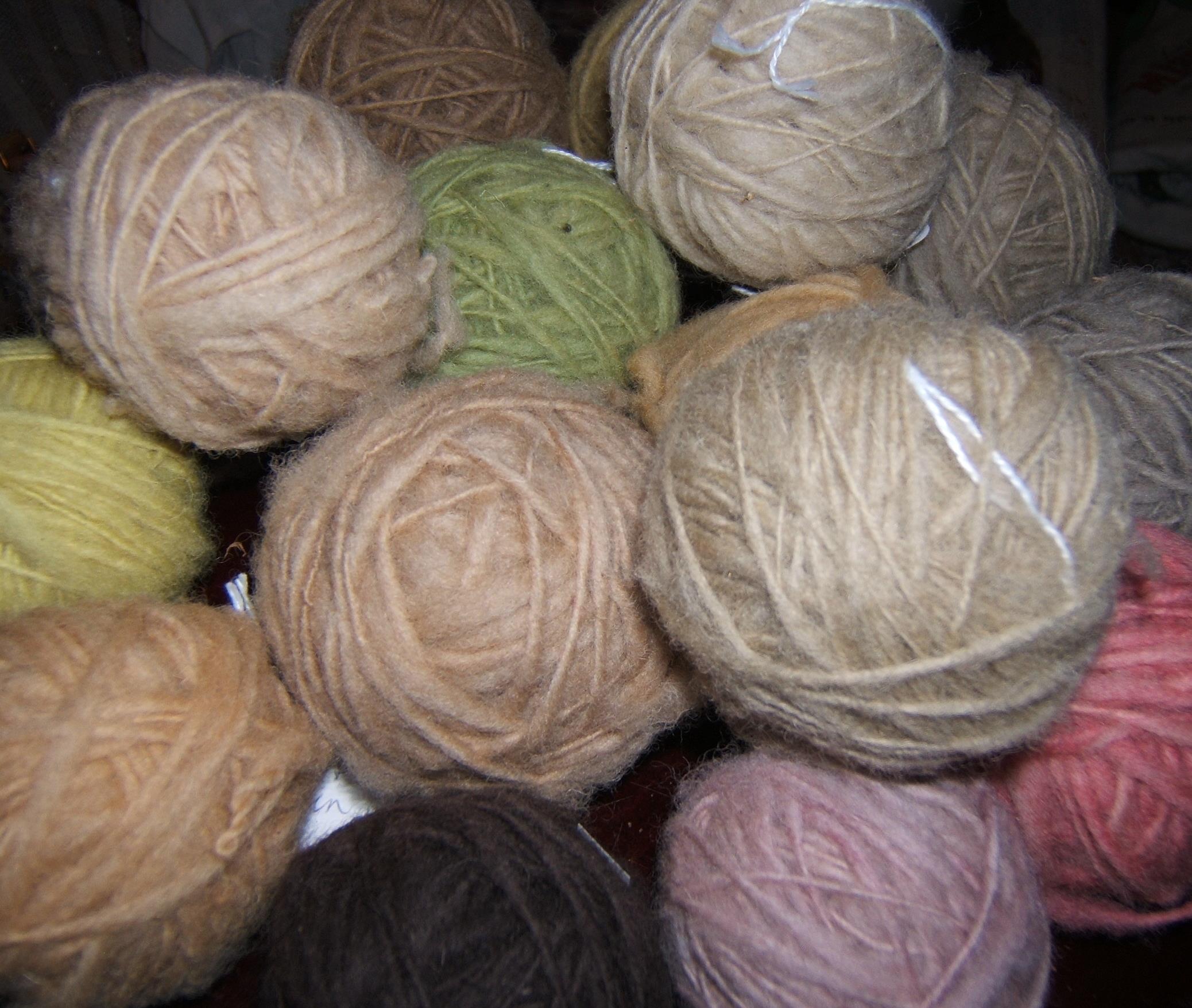 in background, alum-treated wool dyed with rose hips; in the foreground, spun wool dyed with lichen, beet leaves and alder bark