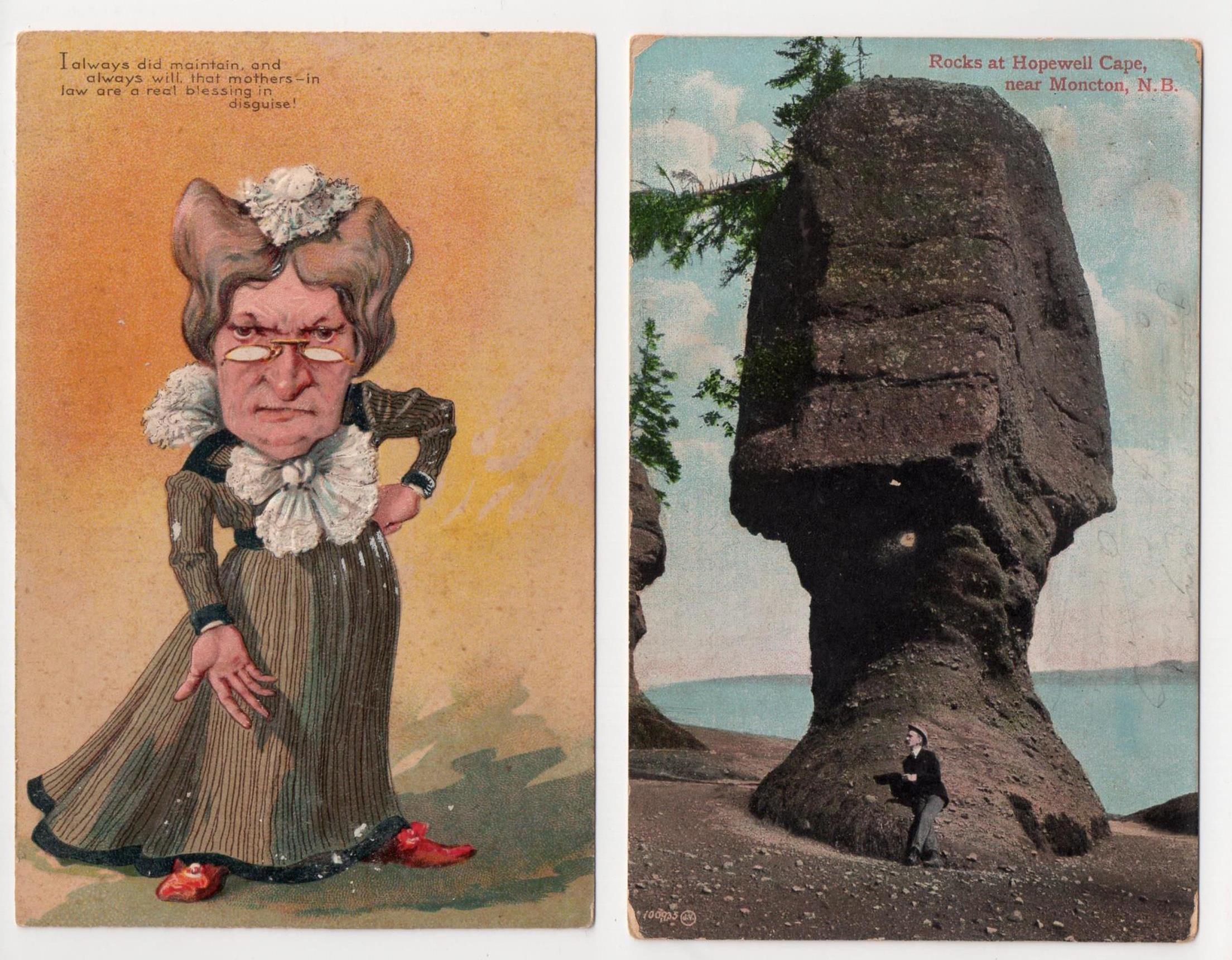 The card on the left pokes fun at Mother-in-laws (1910) ; the post card on the right is one of many scenic views, this one of the ‘flower pot’ formations near Alma, New Brunswick (1907).