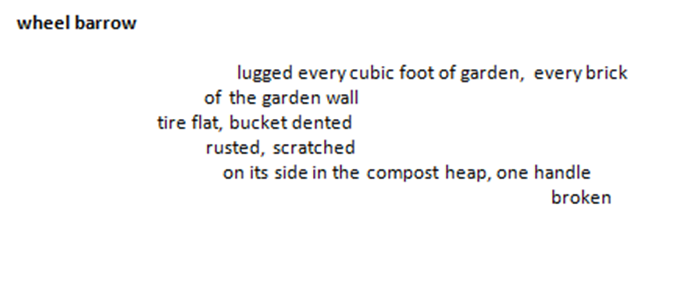 Here is a poem about an abandoned wheel barrow, part of my manuscript on derelict elements of our landscape. Like so many items, this wheel barrow has outlived its usefulness.