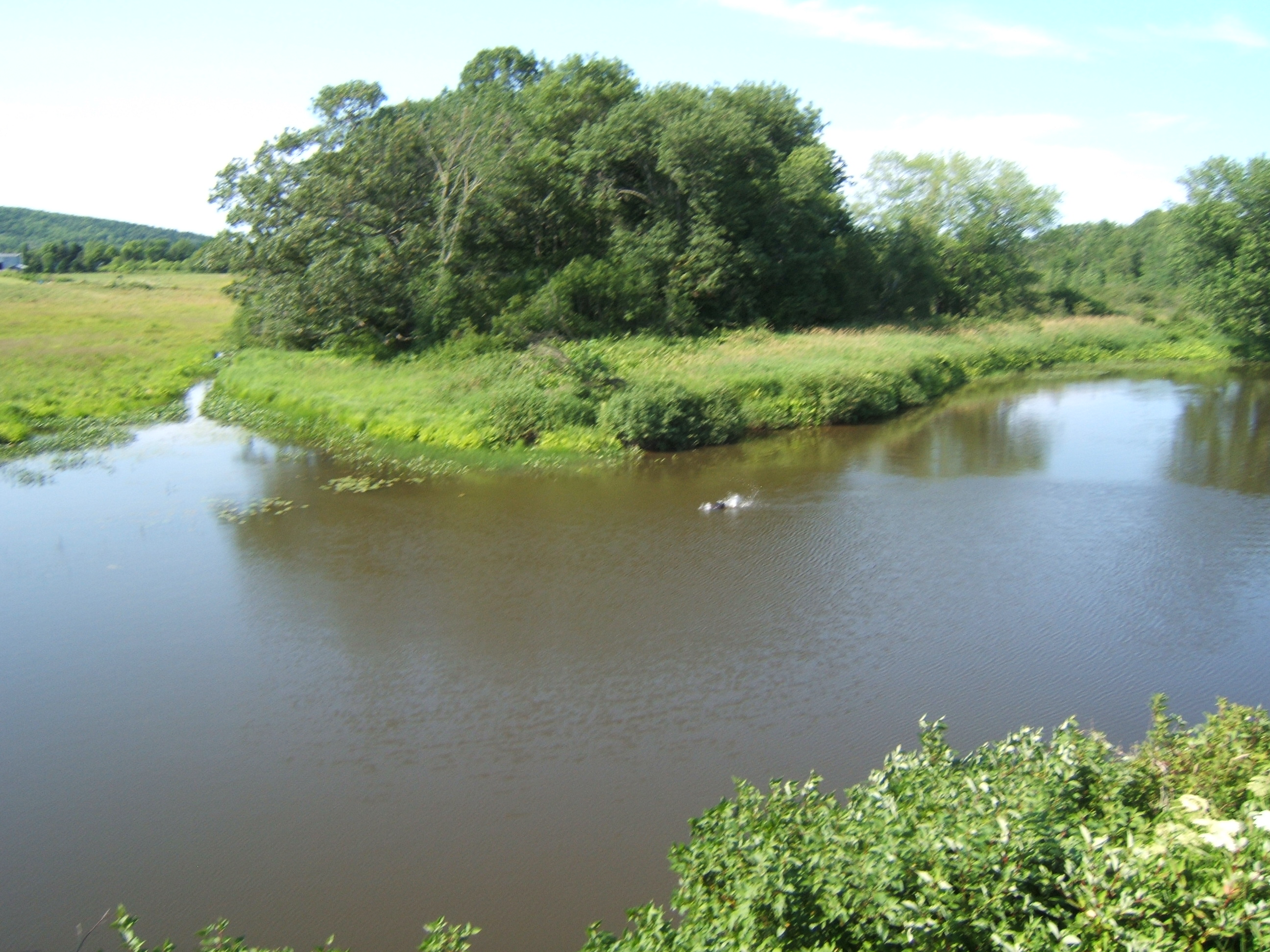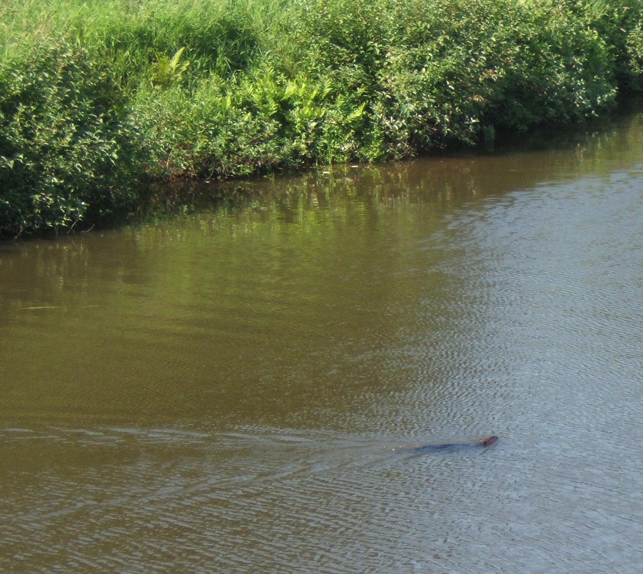 A large beaver kept us company while we visited the bridge. He swam back and forth along the river, in a course we were certain was designed to confuse and hide the location of his lodge. Most of the time he stayed on the surface – so soothing to watch his smooth brown body ‘towing’ a ‘V’ across the water. Every few minutes he would pause in his swim, arch his body, scissor his tail and lift it perpendicular to the water surface. Then he would slap the water and produce a loud ‘k-thud’ before he dove beneath the surface. In a minute or so, he would reappear to swim as calmly as before.
