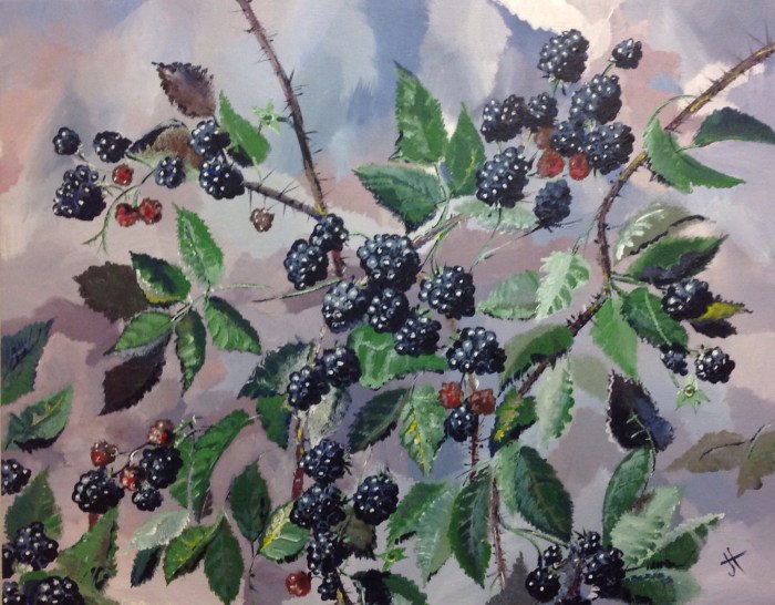 This is to remind you that I am holding a draw to win another painting — ‘berries and brambles’ (18”x 14”, acrylic, gallery edges, unframed). Anyone who has purchased my book from me or my publisher, Chapel Street Editions, has already been entered in the draw. This includes the blog comment folk who entered the earlier draw.