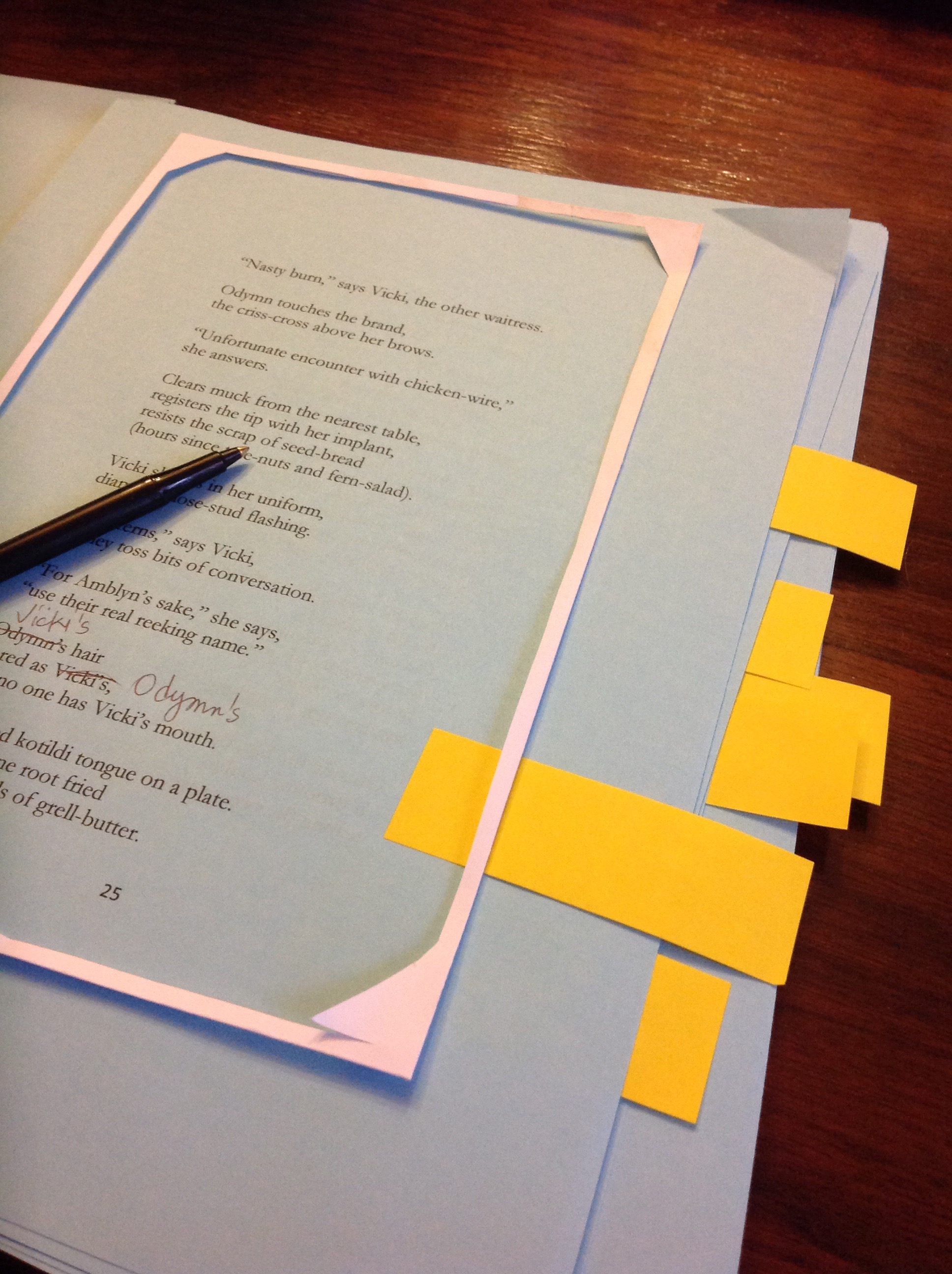 A glimpse of the book in final editing. The blue paper was a gift from my husband who thought he was buying white paper! The yellow tabs are just a few last minute changes. The white frame is my way of seeing how the book will look on the final page size!