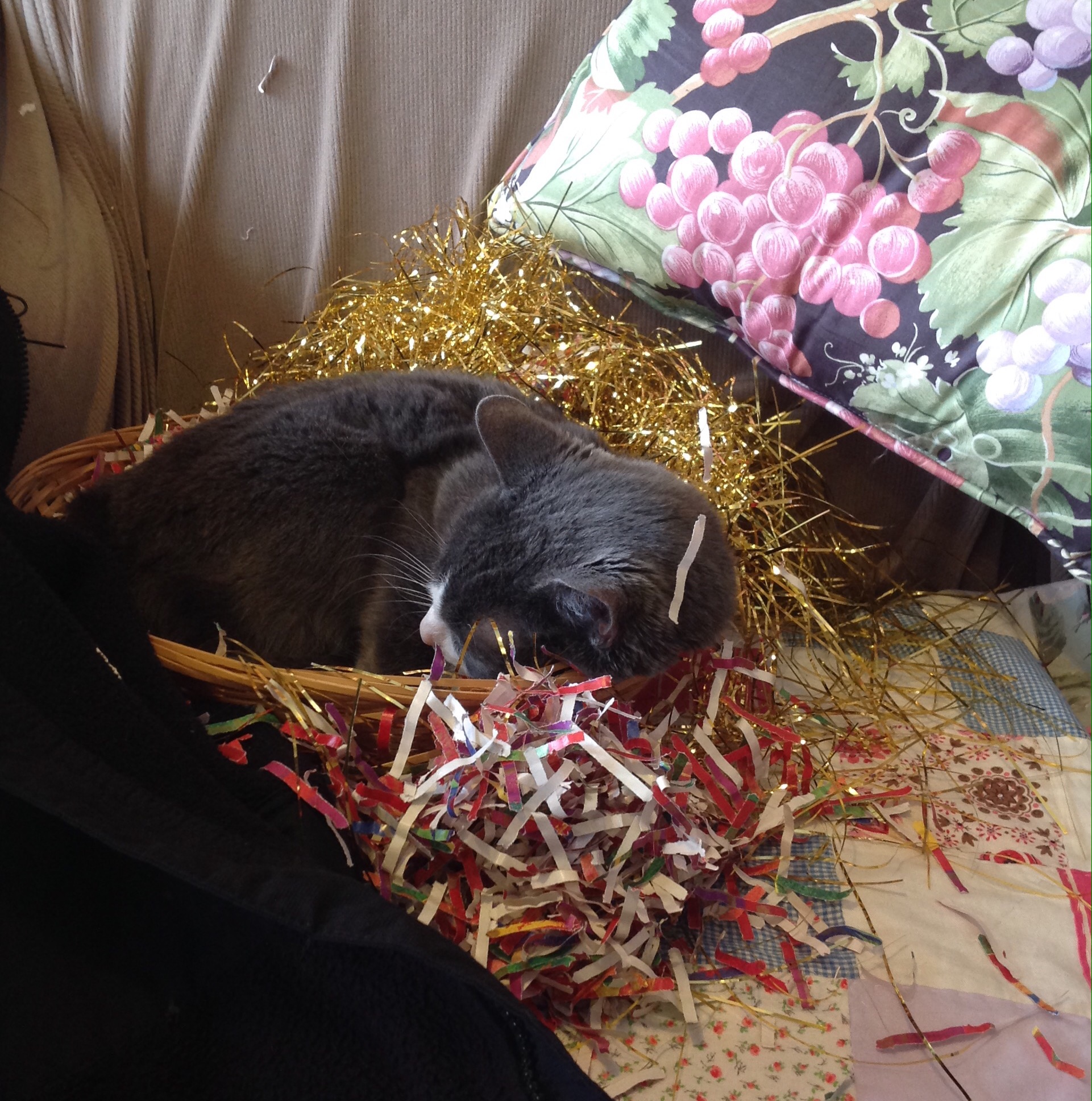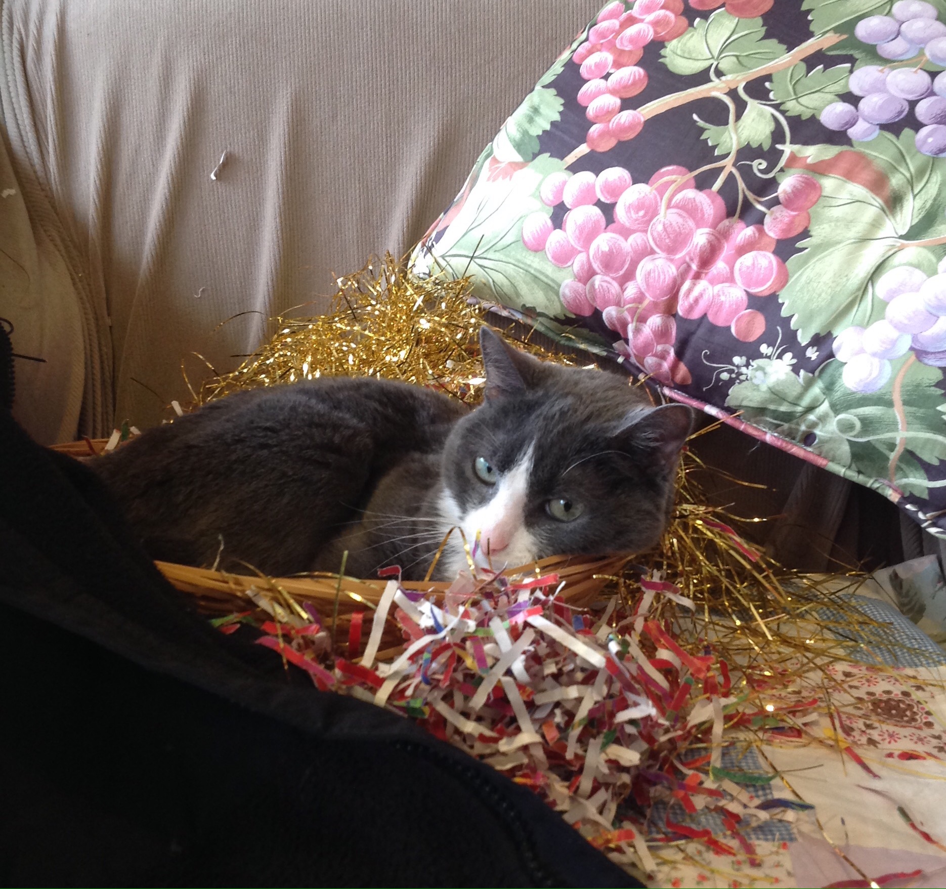 Every Christmas my kind brother-in-law gives us a beautiful basket, filled with homemade pickles and treats and done up with such style. I always save the basket and this morning put it in a chair to go upstairs. Not three minutes later, I came out to the living room to find Zoe in the basket, the straw rearranged to suit her. Not very apologetic either! Sorry, I realise the Net is overrun with photos of well-loved cats!