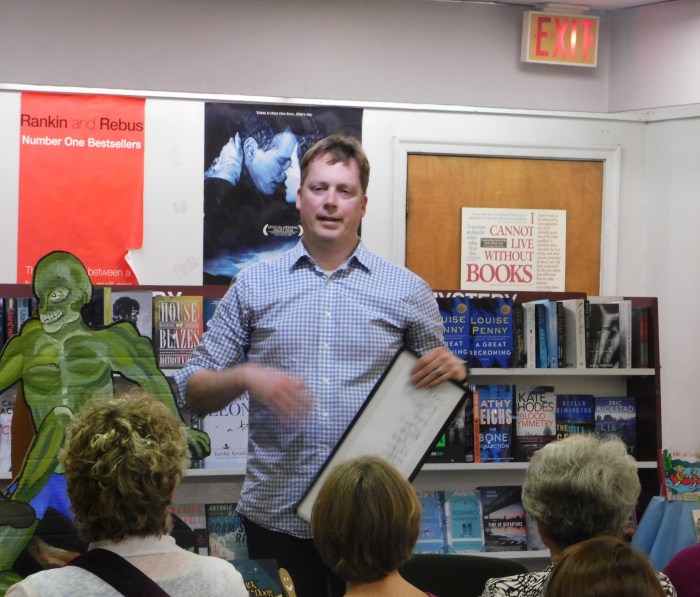 Where? At Westminster Books on King Street in Fredericton, New Brunswick ( have a look at their site here, a great local bookstore). What better place to read than surrounded by books? And helped through the evening by those who love books (Janet North and staff). The day was the hottest of the spring (33 degrees) and I was absolutely dripping by the end of the evening. Some of that is due to my age and lack of stamina. The space is quite comfortable, transformed by chairs into theatre seating for a dozen or more. We had Gel-head punch to drink with lots of ice cubes (green apple, lime juice and gingerale), and three kinds of cookies from the Goody Shop in Fredericton.