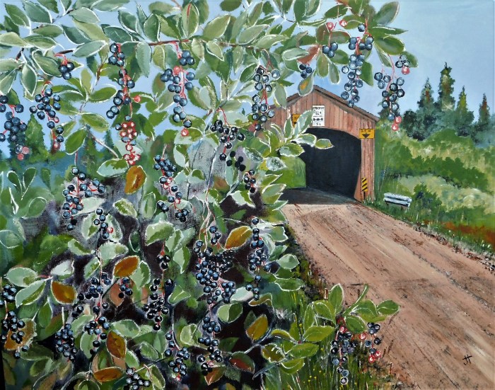 One of the paintings I prepared was ‘choke cherries at Ellis Bridge’ (24″ wide by 20″ high, acrylic, gallery edges, painted June 2016) a study of late summer at the covered bridge over the North Becaguimec River in Carleton County. Since another painting was chosen as the cover art for my book, ‘choke cherries at Ellis Bridge’ is my new submission to Isaacs’s Way Restaurant for their art auction. My painting ‘Farmyard in Winter’ sold before the Autumn Art Auction #31 was over and most artists submit a painting to fill their ‘space’.