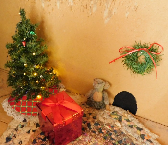In our house, everyone celebrates Christmas, even the mouse who lives under the stair. Here he is, beside his mouse hole, with his well-lit Christmas tree and wreath. He has a big gift to open on Christmas day! Heads up, the lines on the wall at the top of the photo are made by our cat!