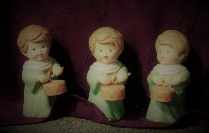 I actually have three ‘little drummer boys’ for the set; two of these belonged to my mom. I bought one drummer boy each for my mom and my mother-in-law, and gave one to Mom in 1992. Then I forgot I had given her the first, so she got another from me in 1993. I know the years because Mom labelled her belongings with the giver and year. My mother-in-law never did get a drummer boy figure!