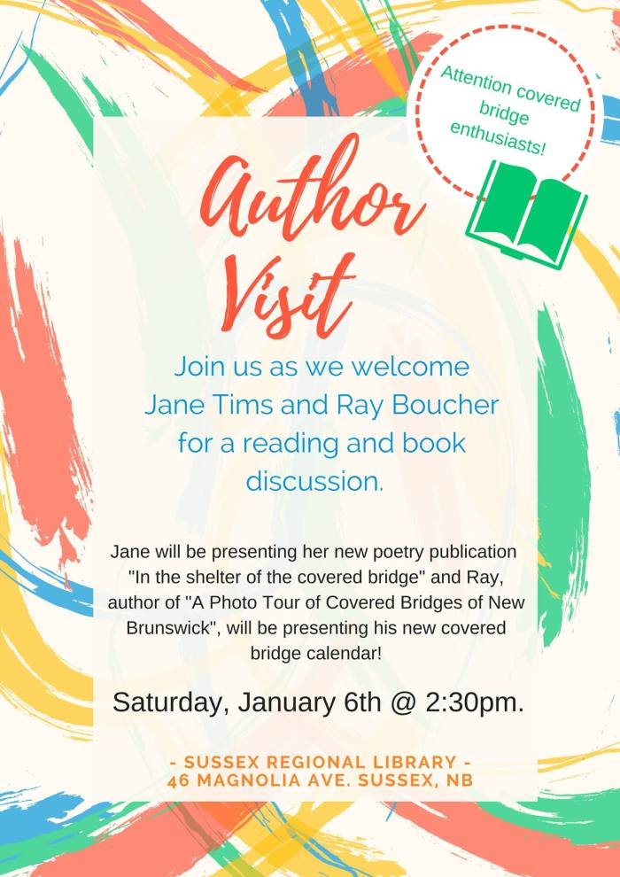 On January 6, 2018 I will be at the Sussex Public Library to read from my book ‘in the shelter of the covered bridge’ and sign copies. I will be joined by a well-known covered bridge enthusiast Ray Boucher. Ray is the author of ‘A Photo Tour of the Covered Bridges of New Brunswick’ (Kissing Bridge Publications, 2014) and his 2018 calendar featuring photos of some of New Brunswick’s covered bridges. Books and calendars will all be for sale.