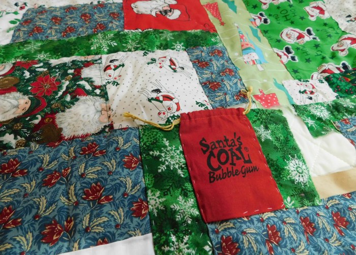 My quilting project for this year may seem a little out-of-season. I took all the bits of Christmas fabric I have collected from various projects over the years and put them into a small patchwork lap quilt – just 40″ by 40″. If my husband and son look closely they will see my husband’s Christmas necktie, little bags for ‘coal’-flavoured candy brought by Santa one year, a pair of Santa-patterned shorts I bought as a joke, remnants of the Santa Cool sock I won one year at work at Christmas and so on. When there was a ribbon or draw-string associated with the remnant, I just incorporated it into the quilt. Perhaps someone will use the coal-sacs for a little treasure.