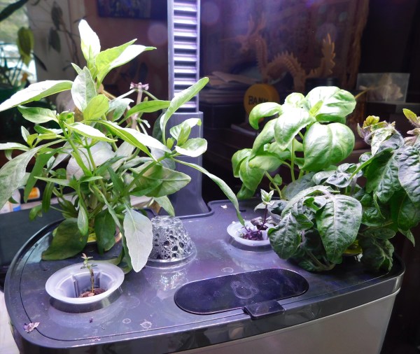 A while ago, I told you I was starting an AeroGarden. The garden grows plants in ‘pods’, with addition of light, water and nutrients. After 54 days, my garden is growing mint and two kinds of basil in profusion. Two of the plants, thyme and another type of basil, are very slow, but growing and healthy. A fifth pod got mold and never grew.